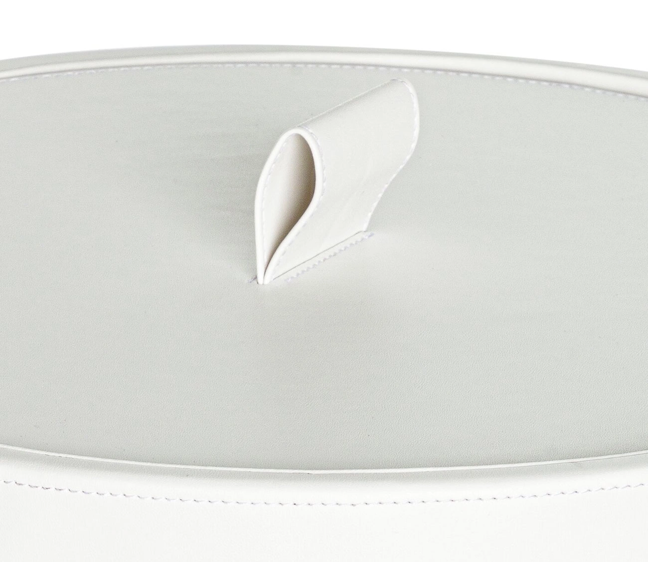 Okrągły kosz na pranie Cornflower Grey marki JOOP!. Wyposażony w pokrywę z poręcznym uszkiem, oraz dwa uchwyty. Wykonany z ekoskóry w kolorze białym z szarym motywem cornflower.