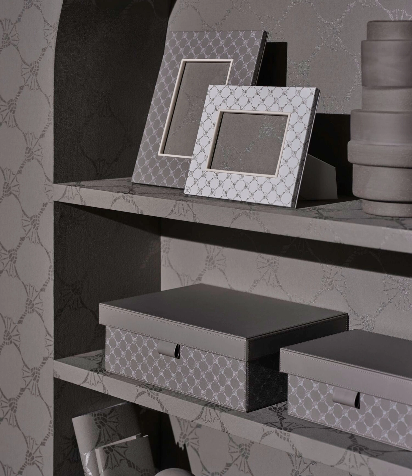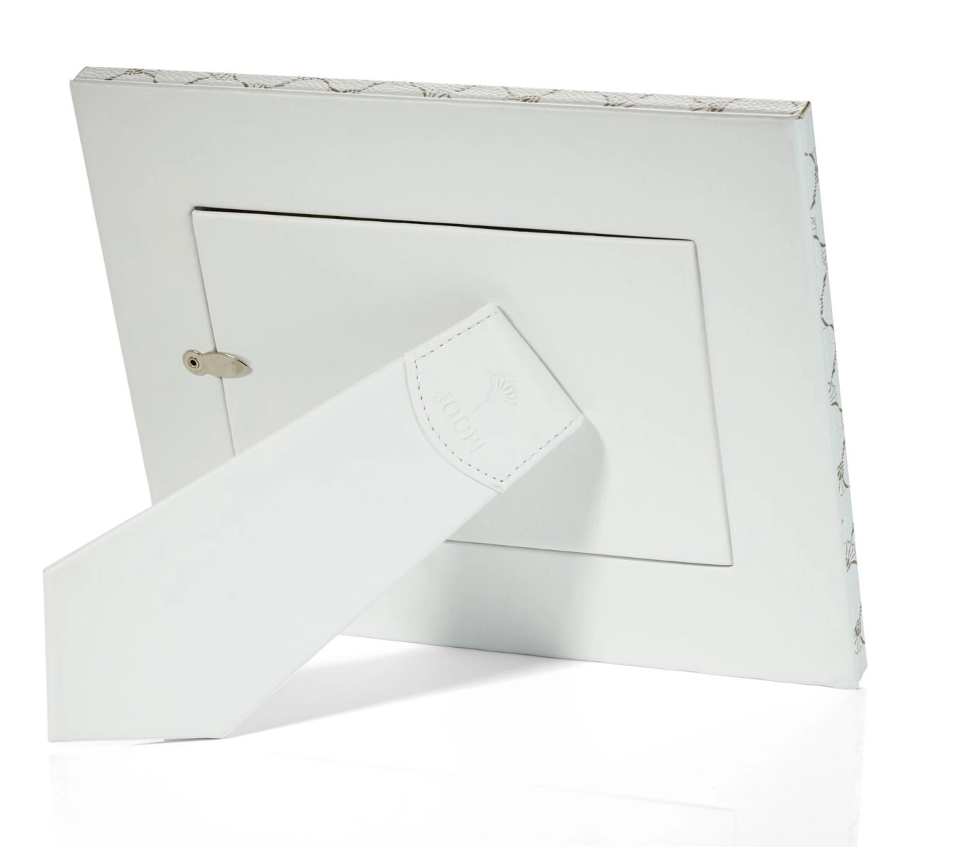 Ramka na zdjęcia Cornflower marki JOOP!. Wykonana z trwałej ekoskóry w kolorze białym. Ozdobiona motywem cornflower w kolorze szarym. Format zdjęcia 10x15 cm. Możliwość ustawienia w poziomie lub w pionie.