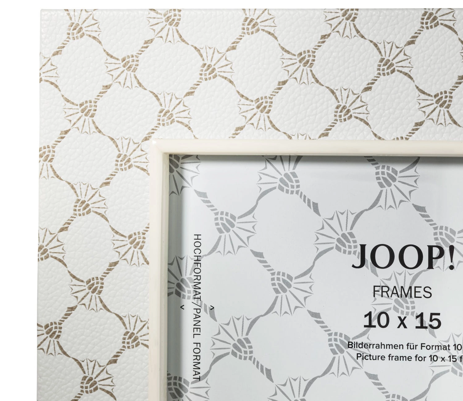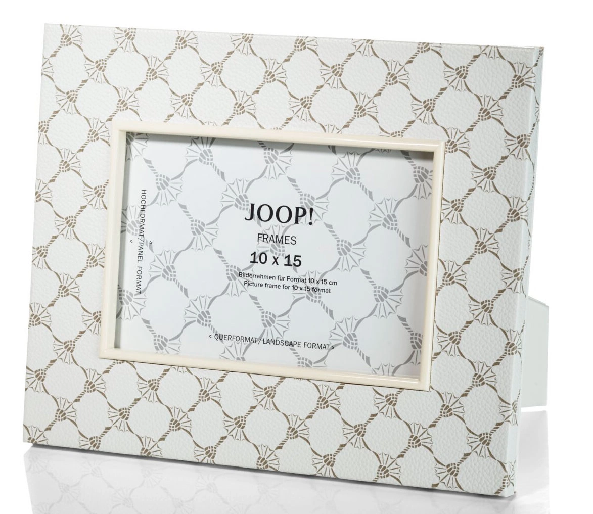 - Ramka na zdjęcia Cornflower marki JOOP!. Wykonana z trwałej ekoskóry w kolorze białym. Ozdobiona motywem cornflower w kolorze szarym. Format zdjęcia 10x15 cm. Możliwość ustawienia w poziomie lub w pionie.