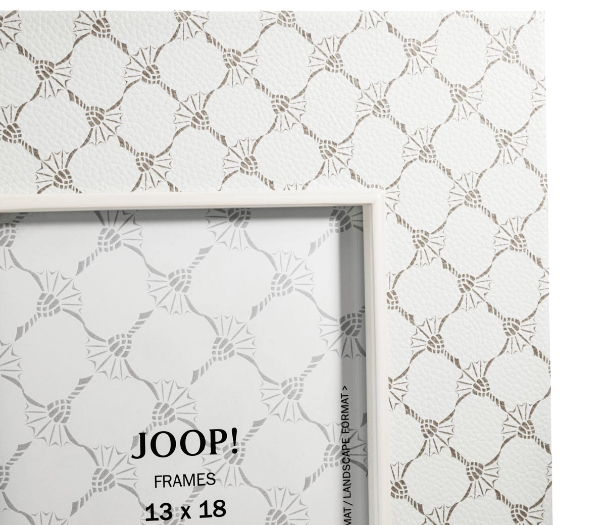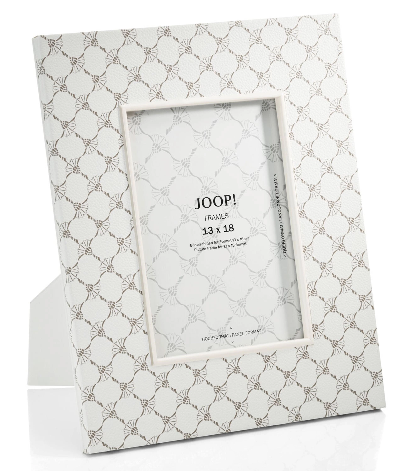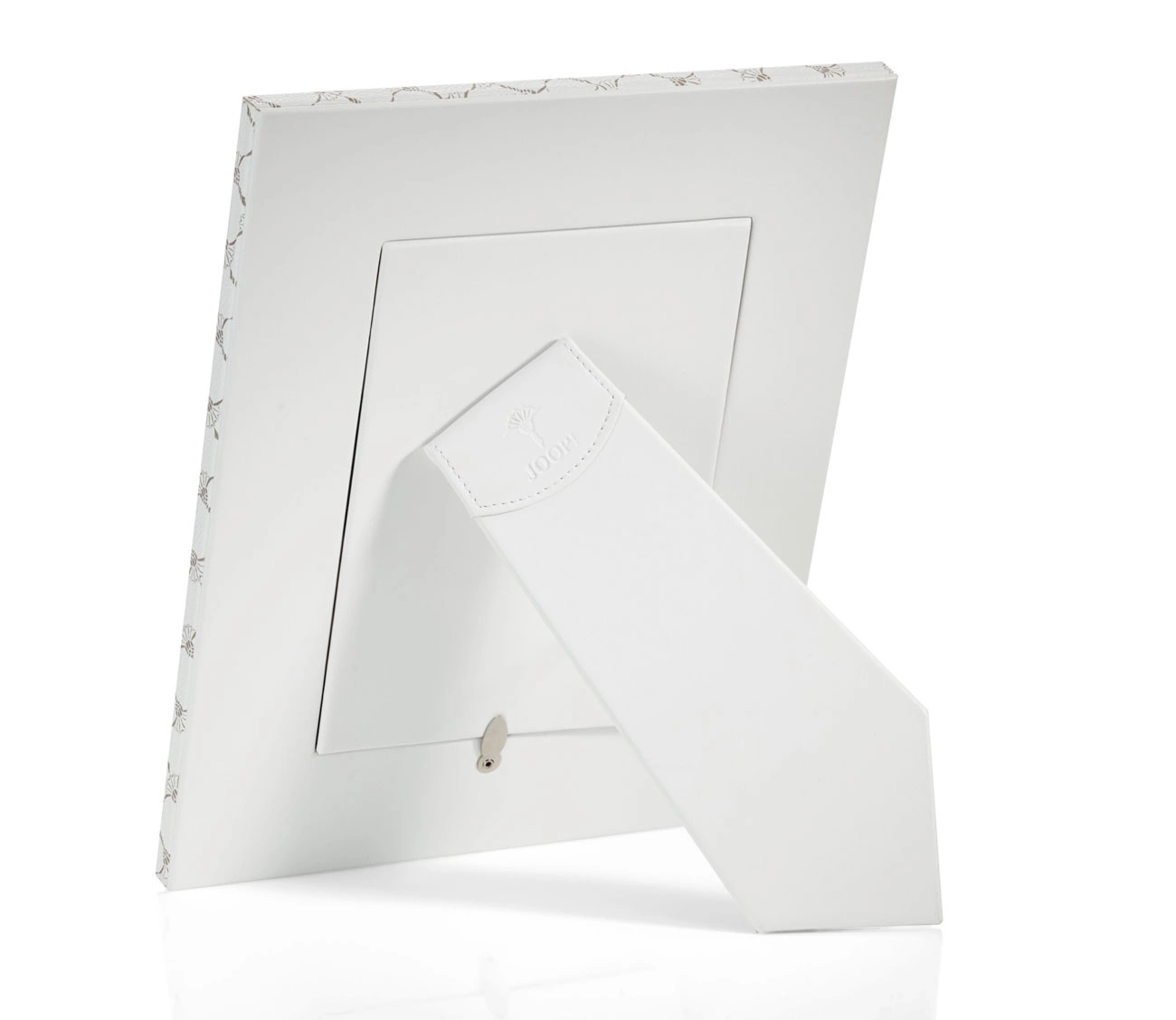 Ramka na zdjęcia Cornflower marki JOOP!. Wykonana z trwałej ekoskóry w kolorze białym. Ozdobiona motywem cornflower w kolorze szarym. Format zdjęcia 13x18 cm. Możliwość ustawienia w poziomie lub w pionie.