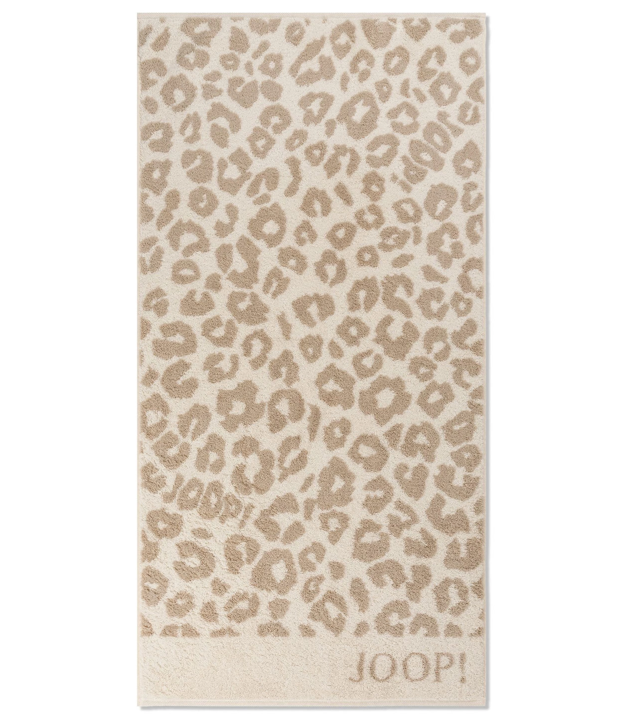 Piękny ręcznik Leo Allover 1707-36 marki JOOP!. Modny wzór zwierzęcy w kolorach kremu i beżu. Idealnie chłonny, miękki i puszysty. U dołu logo marki, u góry praktyczny haczyk do zawieszenia. Trwałość na lata.