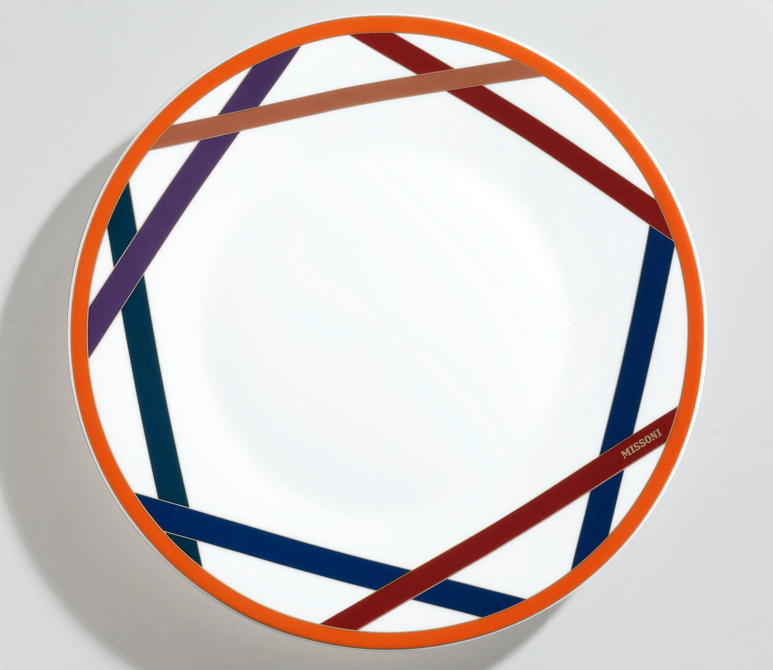 Zestaw dwóch talerzy obiadowych, kolekcja Nastri Multicolor marki Missoni. Charakterystyczny dla marki wzór przecinających się, wielokolorowych wstęg ze złotym wykończeniem. Wykonane z porcelany kostnej.
