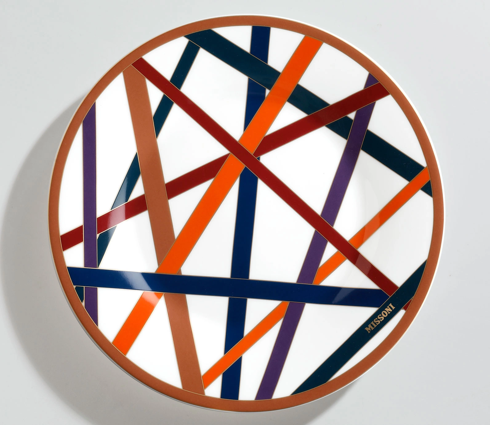 - Zestaw sześciu talerzy deserowych, kolekcja Nastri Multicolor marki Missoni. Charakterystyczny dla marki wzór przecinających się, wielokolorowych wstęg ze złotym wykończeniem. Wykonane z porcelany kostnej.