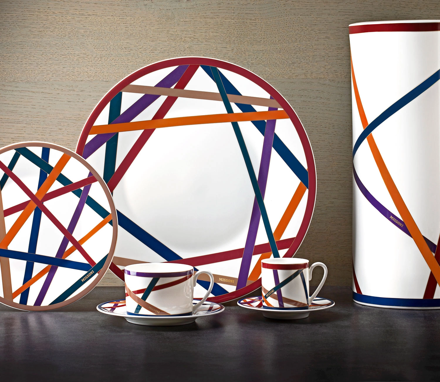- Zestaw sześciu misek do zupy, kolekcja Nastri Multicolor marki Missoni. Charakterystyczny dla marki wzór przecinających się, wielokolorowych wstęg ze złotym wykończeniem. Wykonane z porcelany kostnej.