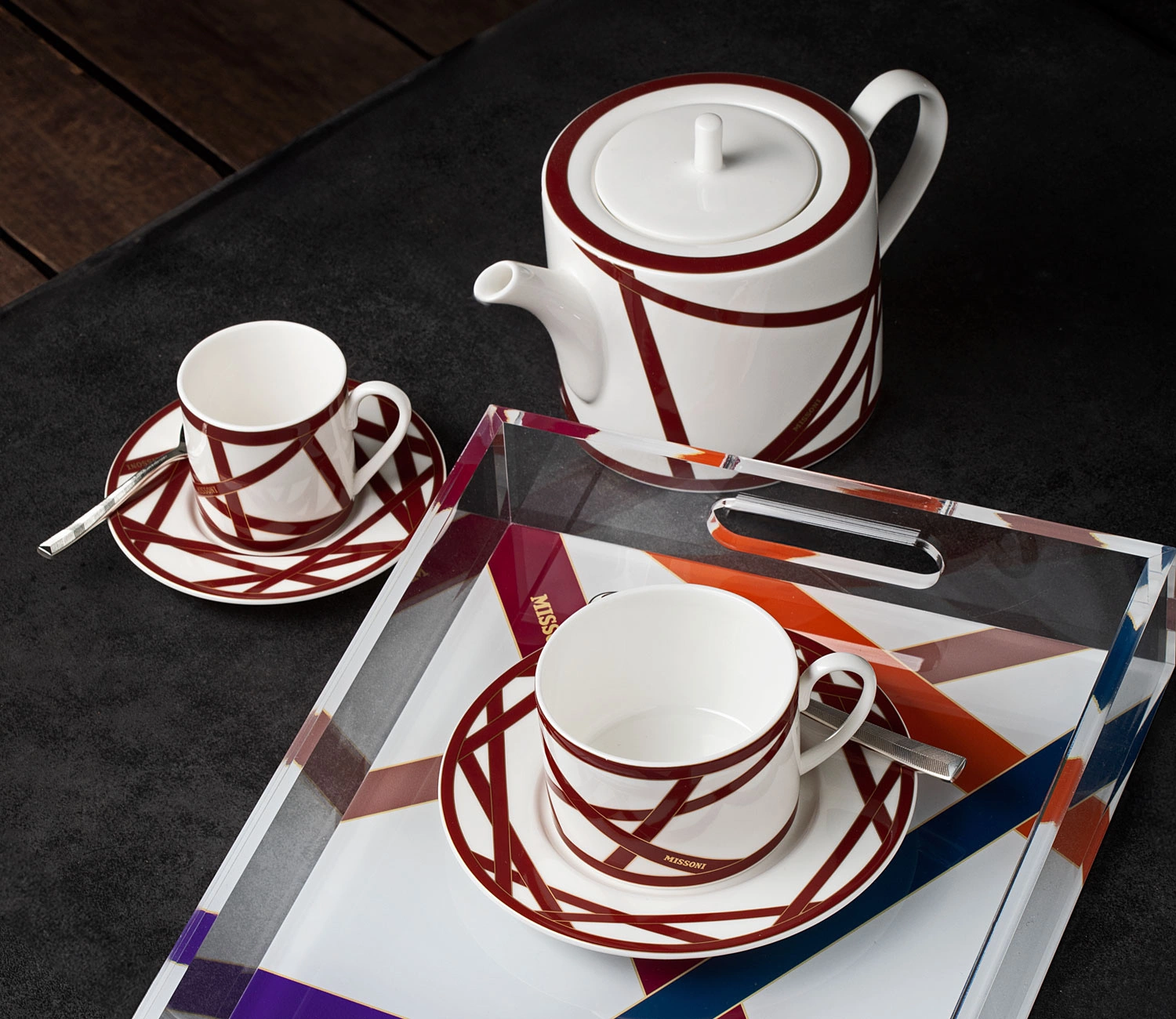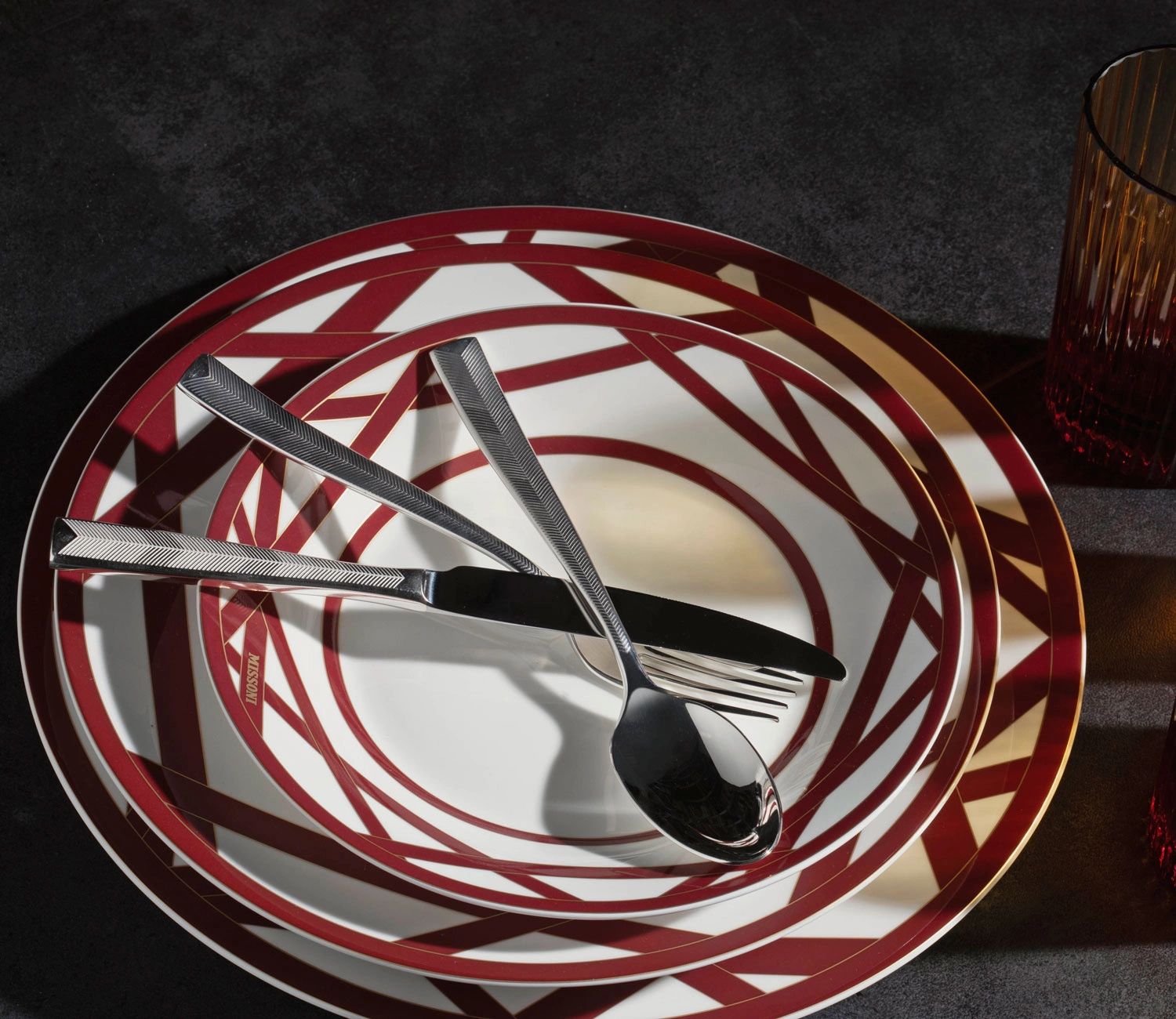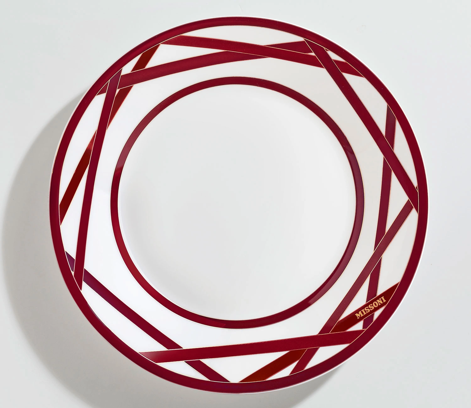 - Zestaw sześciu głębokich talerzy do zupy, kolekcja Nastri Bordeaux marki Missoni. Charakterystyczny dla marki wzór przecinających się, bordowych wstęg ze złotym wykończeniem. Wykonane z porcelany kostnej.