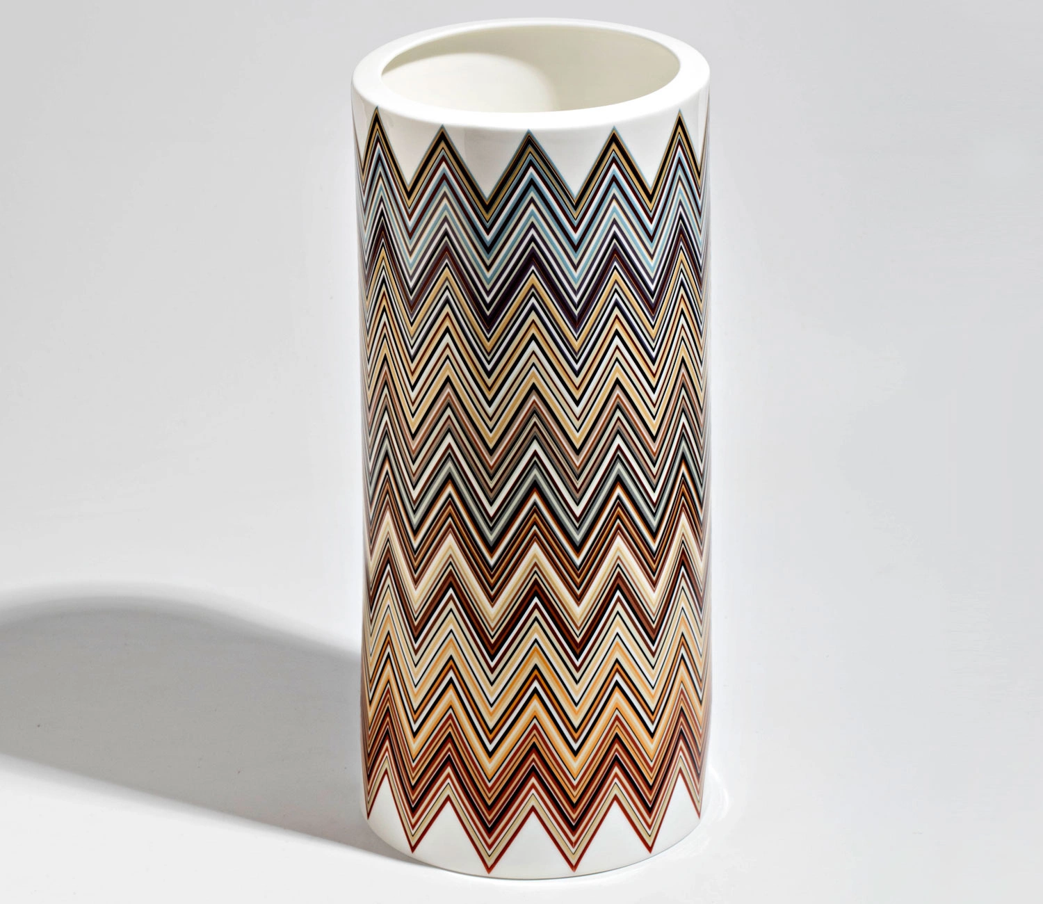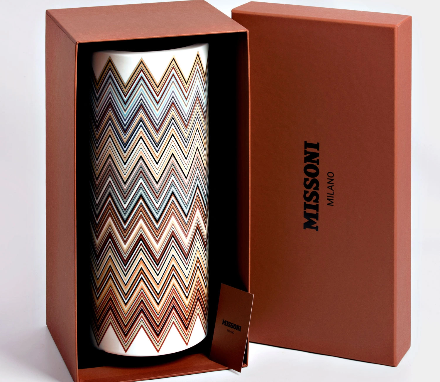 - Wysoki wazon z kolekcji Zig Zag Jarris 148 marki Missoni. Energetyczny wzór w harmonijnie połączonych ciepłych i zimnych kolorach. Wykonany z porcelany kostnej, zapakowany w pudełko prezentowe.