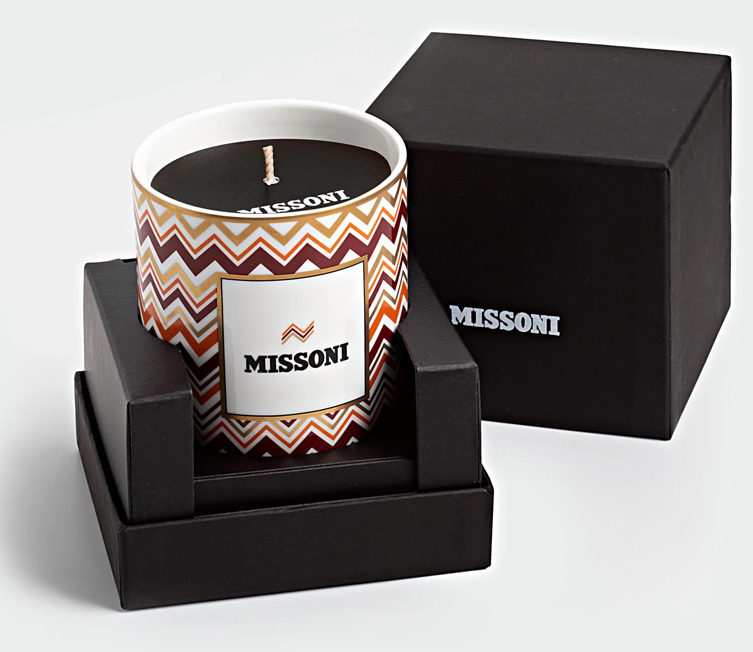 - Zapachowa świeca Iconic marki Missoni. Wosk umieszczony w luksusowym pojemniku z porcelany kostnej z energetycznym wzorem. Zapach drzewno-orientalny. Zapakowana w eleganckie pudełko prezentowe.