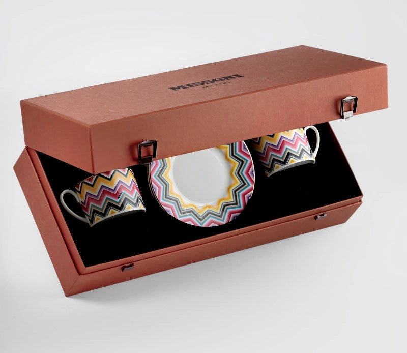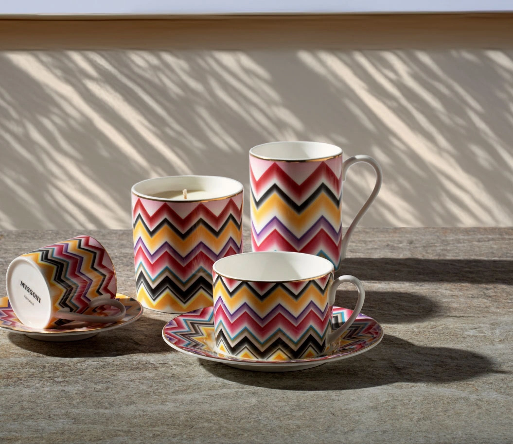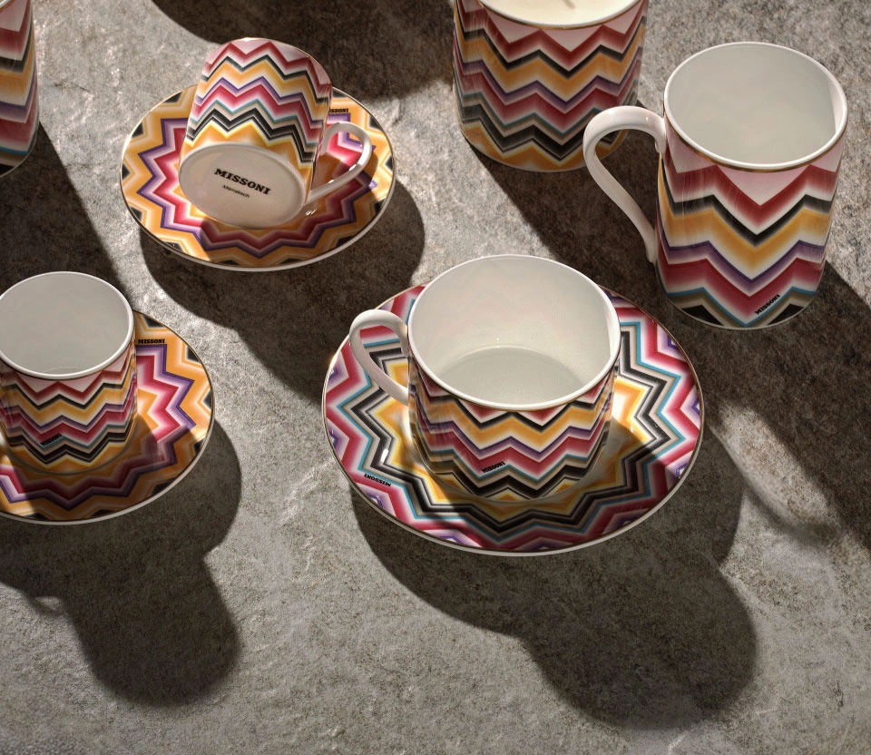 - Zestaw dwóch filiżanek do herbaty wraz ze spodkami, kolekcja Marrakech marki Missoni. Mocny wzór w energetycznych kolorach, delikatne złote zdobienia. Wykonane z porcelany kostnej, zapakowane w pudełko prezentowe.