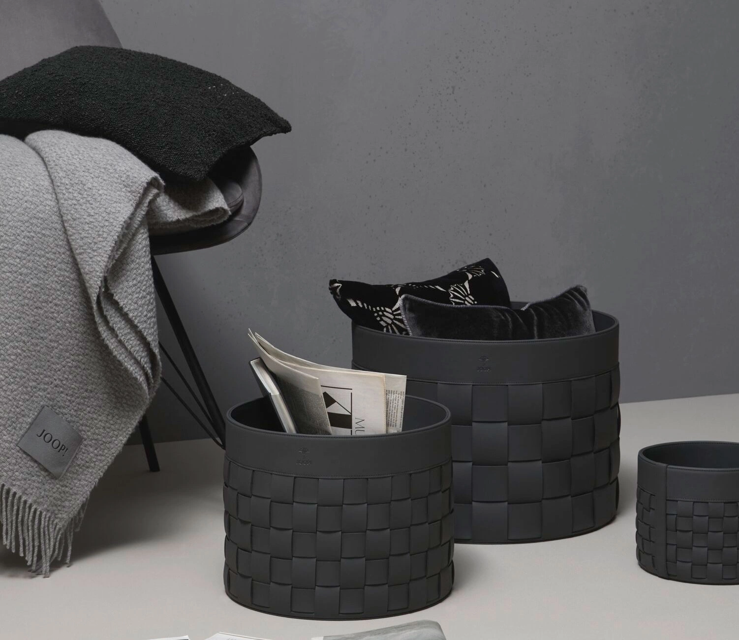 - Średniej wielkości, pleciony kosz Cornflower M marki JOOP! w kolorze antracytowym. U góry wytłaczane logo. Wykonany z ekoskóry, z efektownymi przeszyciami. Idealny do łazienki lub salonu.