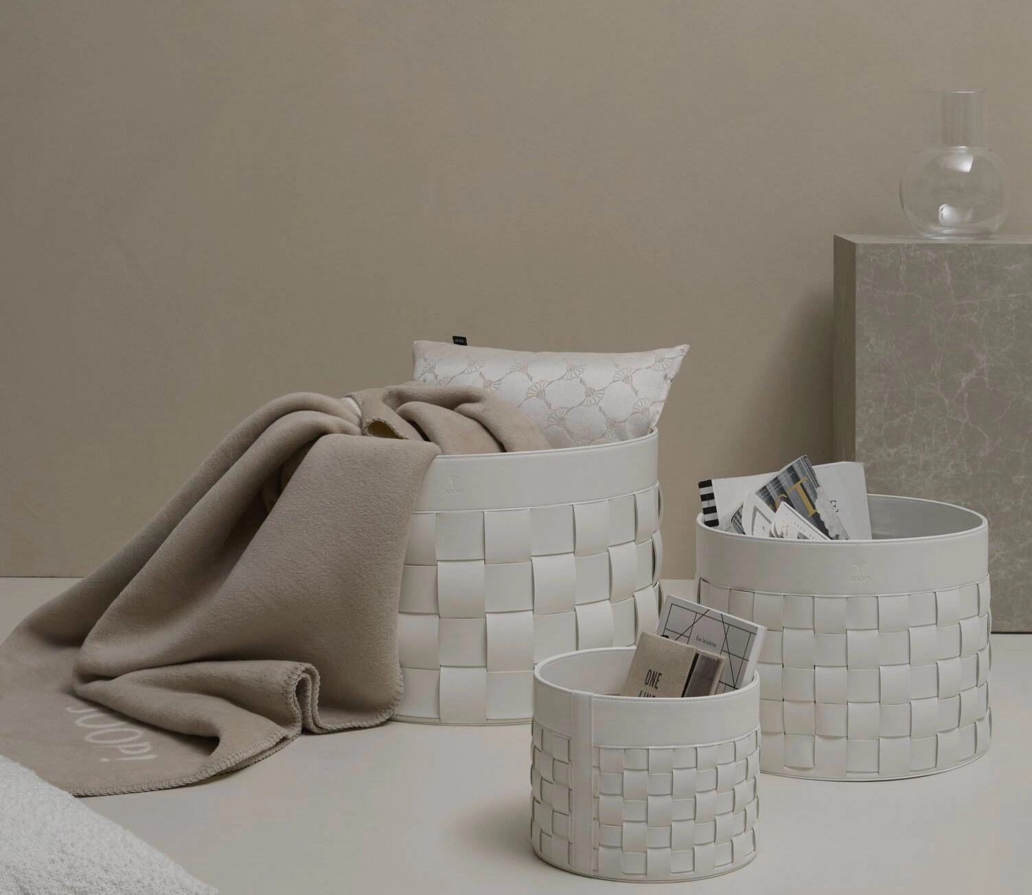 • Duży, pleciony kosz Cornflower L marki JOOP! w kolorze białym. U góry wytłaczane logo. Wykonany z ekoskóry, z efektownymi przeszyciami. Idealny do łazienki lub salonu.