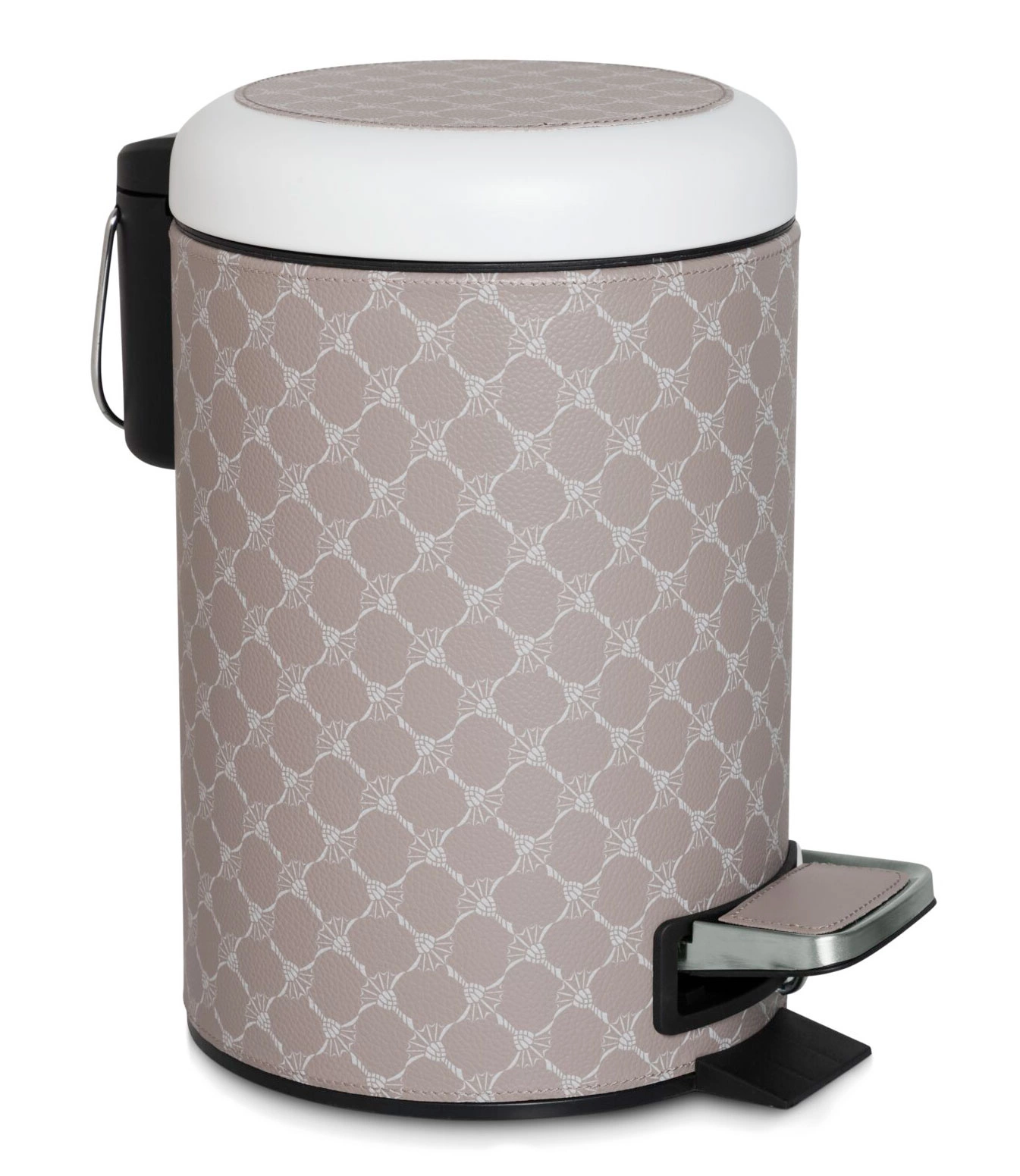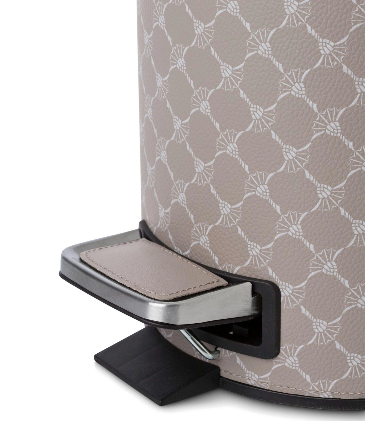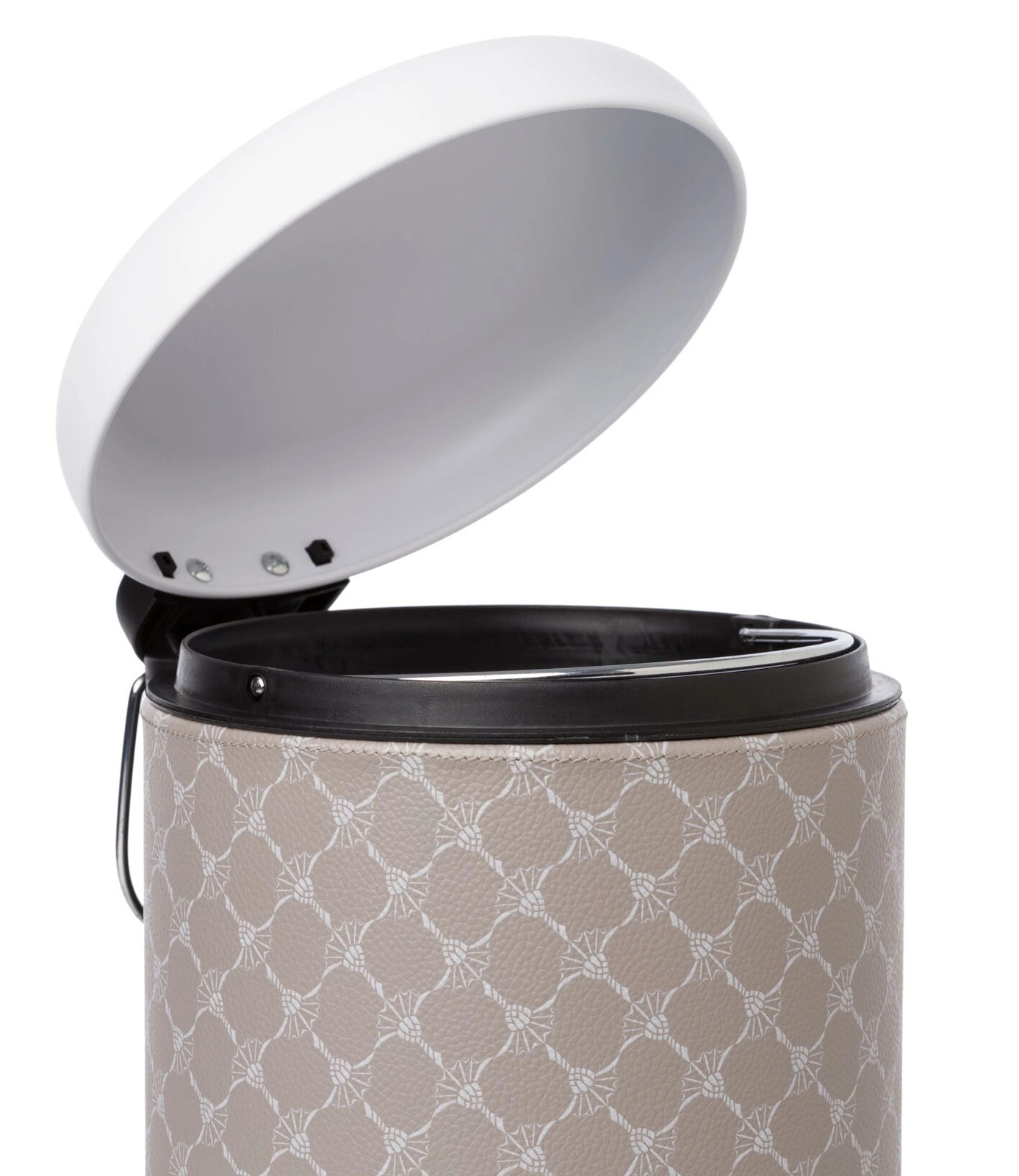 Kosz na śmieci Cornflower marki JOOP!. Ze stali pokrytej ekoskórą w kolorze szaro-beżowym, z motywem cornflower. Otwieranie za pomocą pedału, w środku dodatkowy wkład.