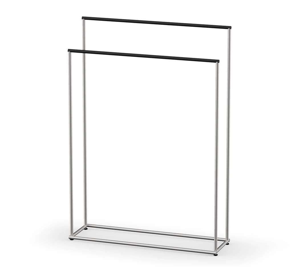 - Stojak na ręczniki MK HT marki Decor Walther. Dwie poprzeczki umieszczone na różnych wysokościach, przymocowane do prostokątnej podstawy, wykonany z mosiądzu kolor stal matowa z czarnymi poprzeczkmi.