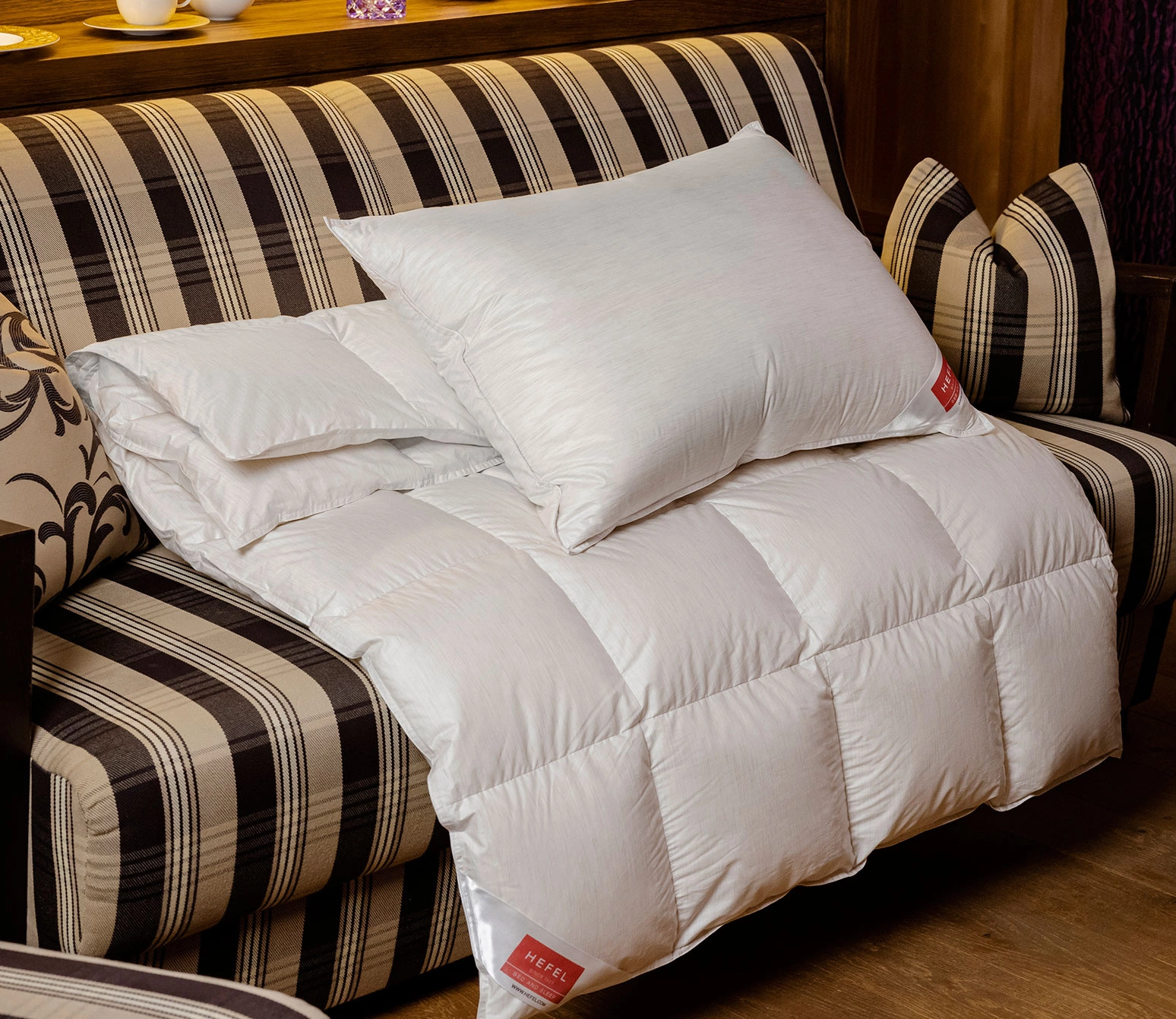 - Letnia kołdra HEFEL Opulence to luksusowa tkanina wykonana z połączenia włókna TENCEL™ i kaszmiru, z wypełnieniem z gęsiego puchu CUIN 850+, oferująca najwyższy komfort w ciepłe noce.