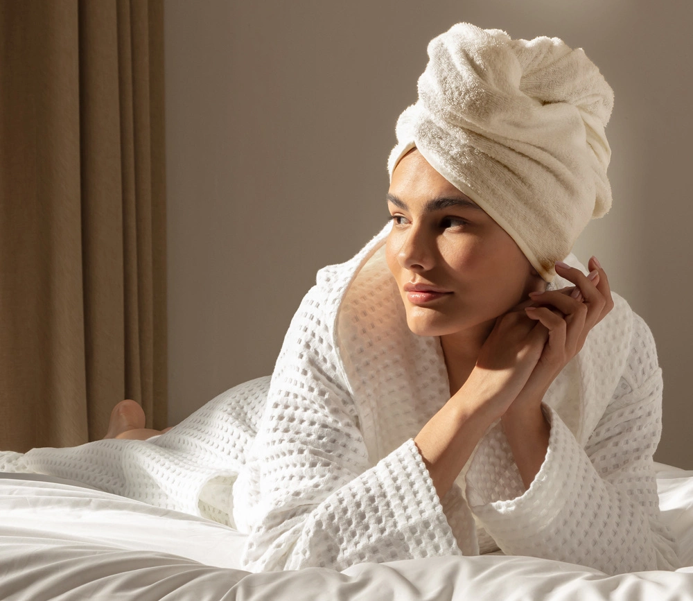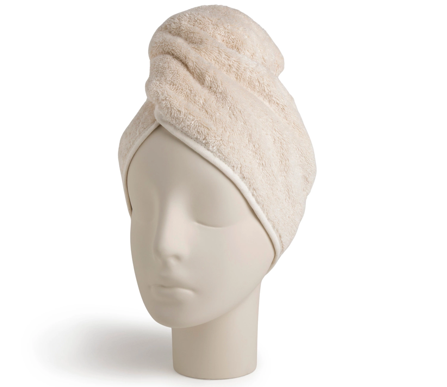 Turban, ręcznik na włosy Wellness marki Möve. Kolor naturalny. Wykonany z bawełny, w technologi Airspin (utrzymującej puszystość). Rozmiar 27 x 67 cm. Zapinany za pomocą guzika z pętelką.