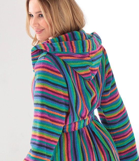 • Damski, długi szlafrok marki Cawö z kapturem w wielokolorowe prążki. Posiada kieszenie, jest wiązany w talii. Wykonany z bawełny 100% jest puszysty i przytulnie miękki. Efektowne i staranne wykończenie gwarantują wysoki poziom komfortu. Długość 120 cm.