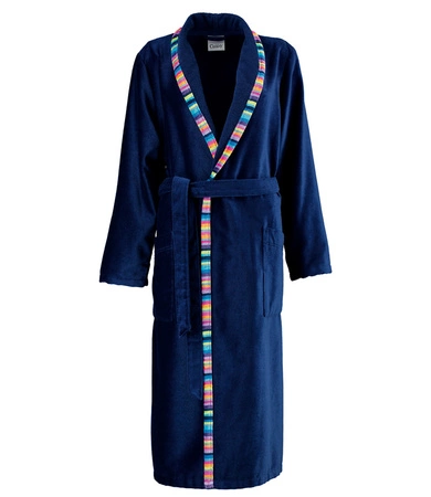 - Damski, długi szlafrok marki Cawö z szalem w kolorze granatowym, wykończony wielokolorową lamówką w prążki. Posiada kieszenie i jest wiązany w talii. Puszysty i przytulnie miękki welur oraz staranne wykończenie gwarantują wysoki poziom komfortu.