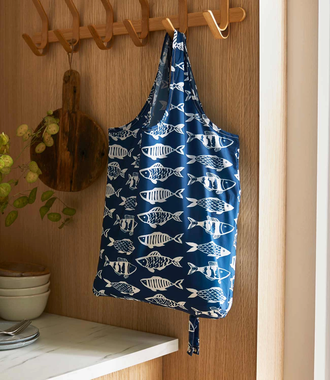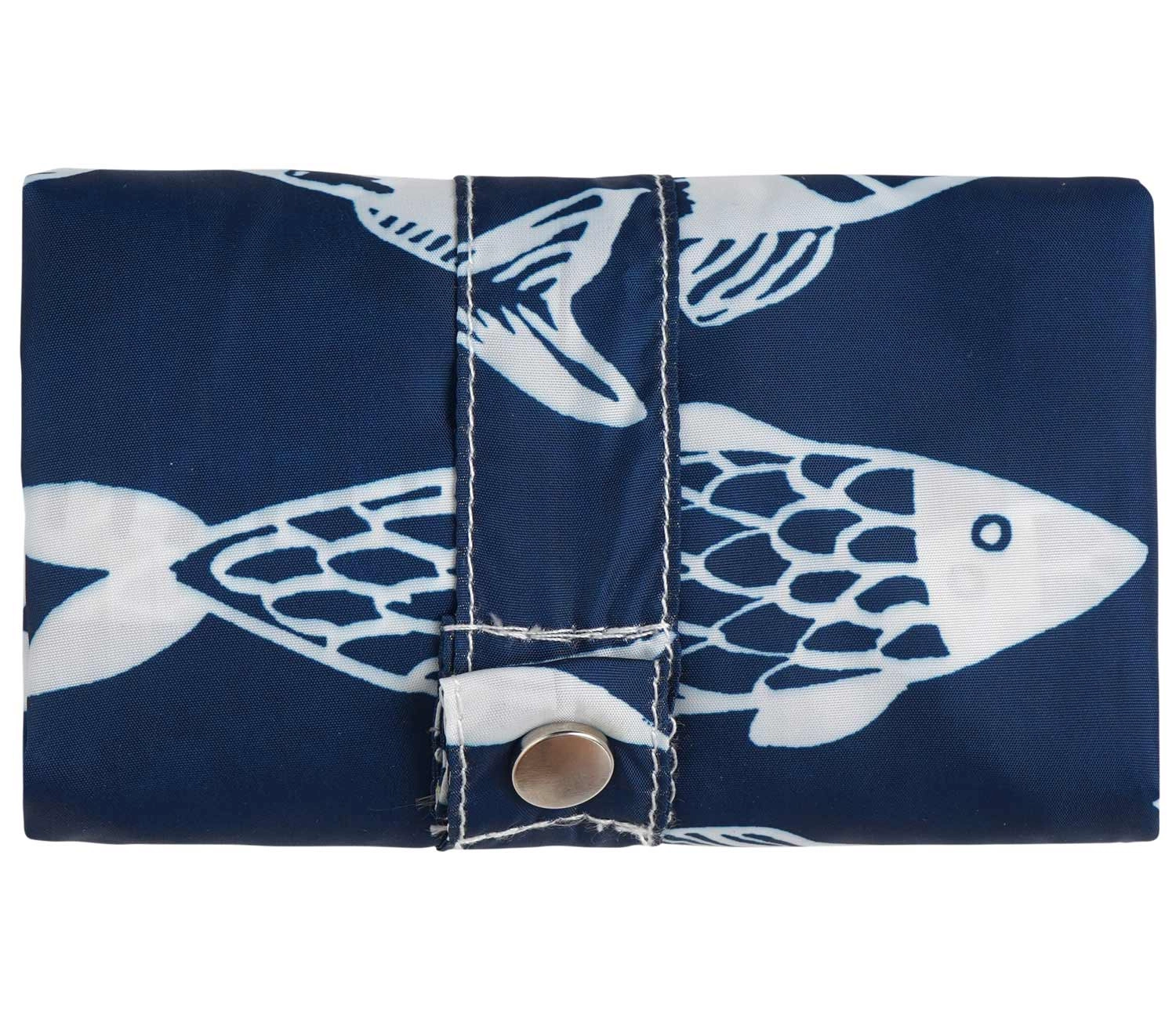 Siatka na zakupy Catch of the Day. Wzór inspirowany nadmorskim klimatem, klasyczna paleta marynistyczna. Dzięki łatwemu zwinięciu i zapięciu na guziki, może być przechowywana w torebce lub kieszeni. Lekka, wytrzymała i wielokrotnego użytku – idealna alternatywa dla plastikowych toreb.