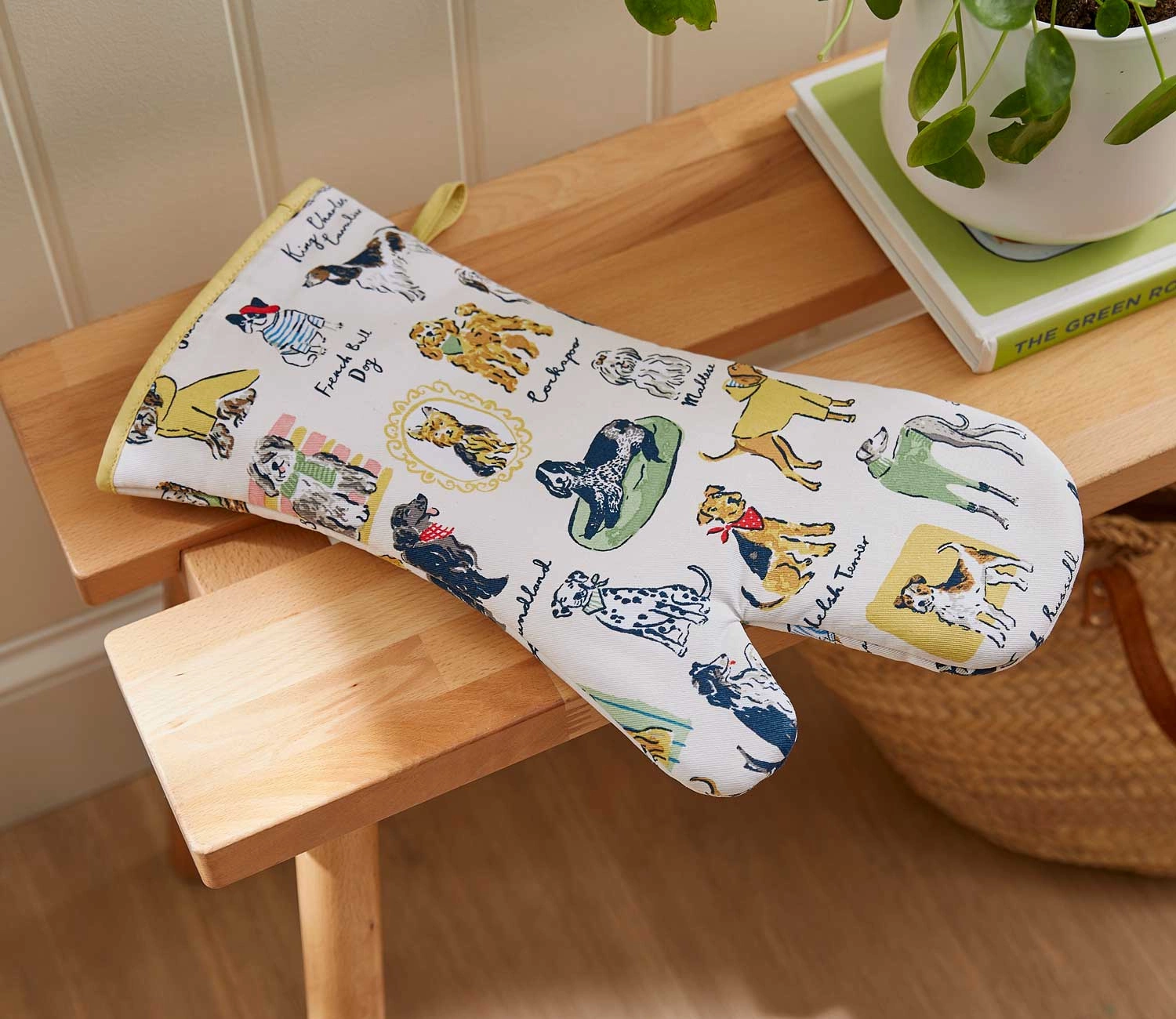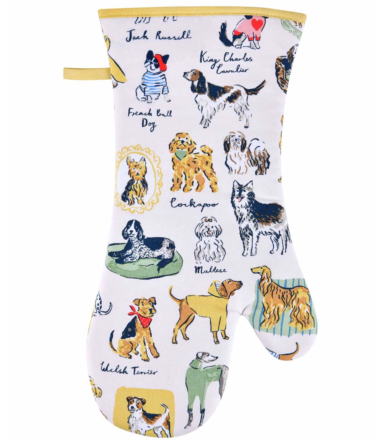 • Rękawica Best in Show - wzór inspirowany miłością do psów, ręcznie malowanych akwarelą z żółtymi, ciepłymi akcentami. Stanowi ochronę dla dłoni przed gorącymi talerzami i tacami w kuchni. Wykonana  w 100% z niebielonej bawełny z wypełnieniem poliestrowym.