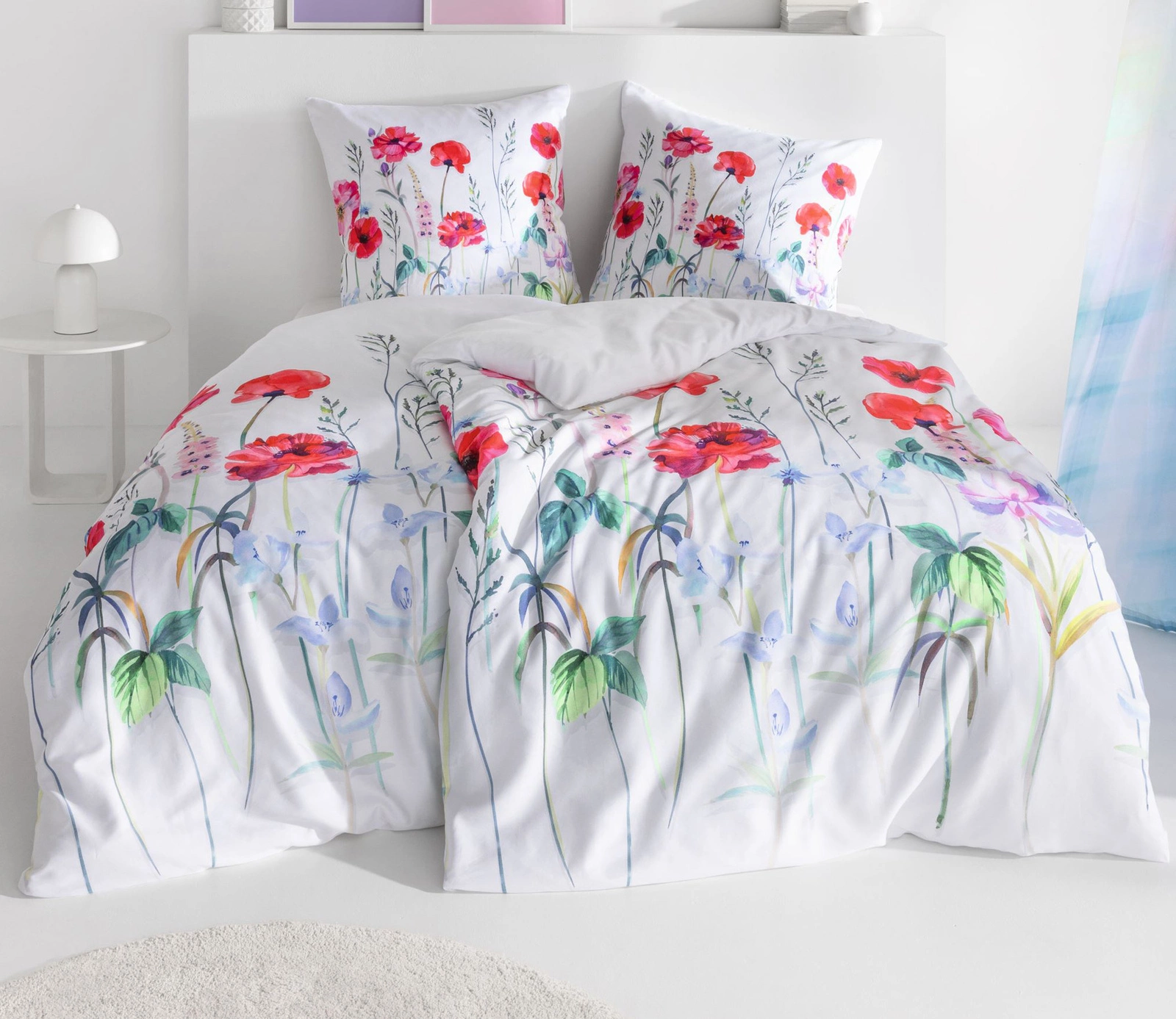 Pościel satynowa Christy 4824-46 marki Estella. Wzór w czerwone maki na białym tle. Wyprodukowana jest w 100% z czystej, czesanej mako-bawełny. Satyna z firmy Estella jest niezwykle przyjemna i przyjazna dla skóry.