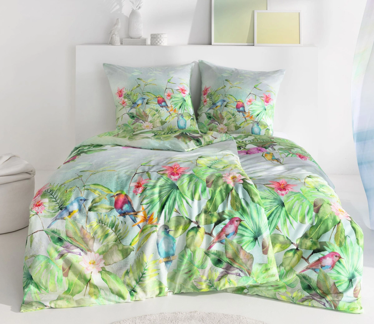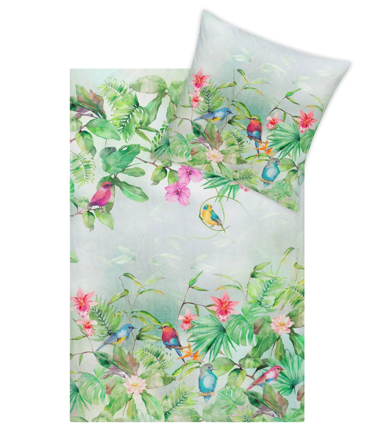 Pościel satynowa Clare 4829-530 marki Estella. Wzór w tropikalne rośliny i ptaki na zielonym tle. Wyprodukowana jest w 100% z czystej, czesanej mako-bawełny. Satyna z firmy Estella jest niezwykle przyjemna i przyjazna dla skóry.