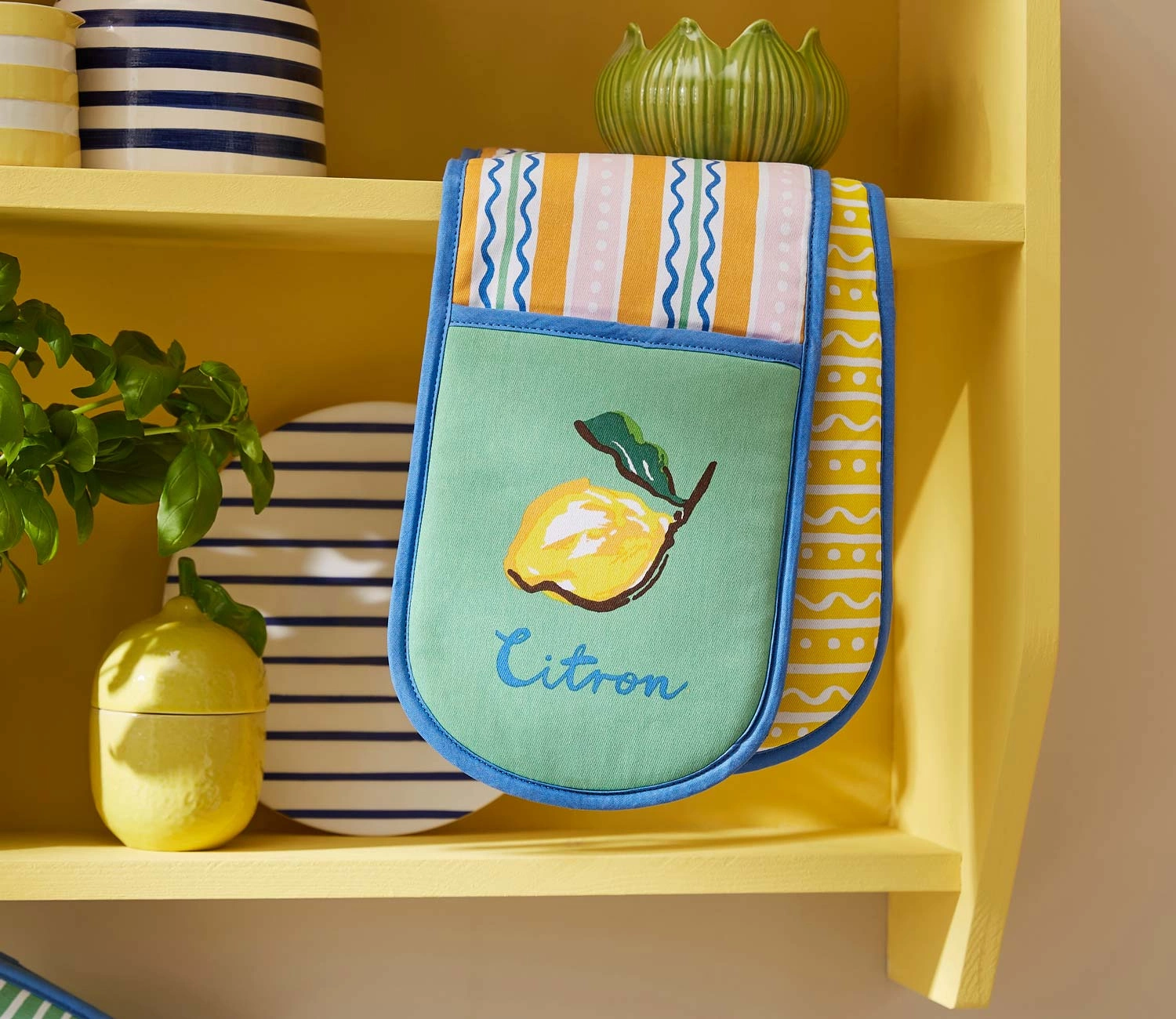 Podwójna rękawica kuchenna Summer Fruits brytyjskiej marki Ulster Weavers to stylowy i funkcjonalny dodatek do każdej kuchni, inspirowany energią retro i kolorowymi francuskimi plakatami vintage. Żywe, soczyste owoce na tle kontrastujących, odważnych barw tworzą radosny, artystyczny wzór, który wnosi do wnętrza dynamikę i świeżość.