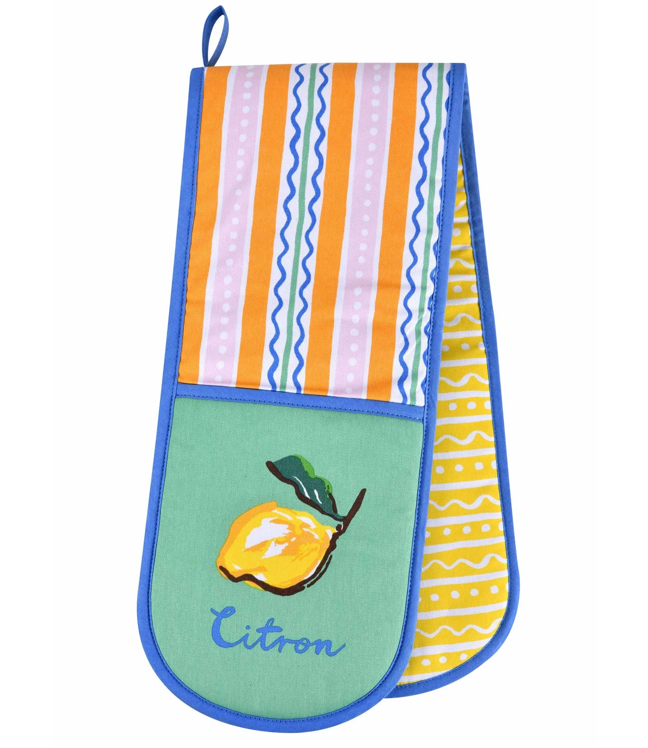 - Podwójna rękawica z kolekcji Summer Fruits. Wzór inspirowany francuskimi plakatami retro, pełen intensywnych kolorów i owocowych motywów. Chroni dłonie przed gorącymi blachami. Wykonana w 100% z bawełny z wypełnieniem poliestrowym dla ochrony.