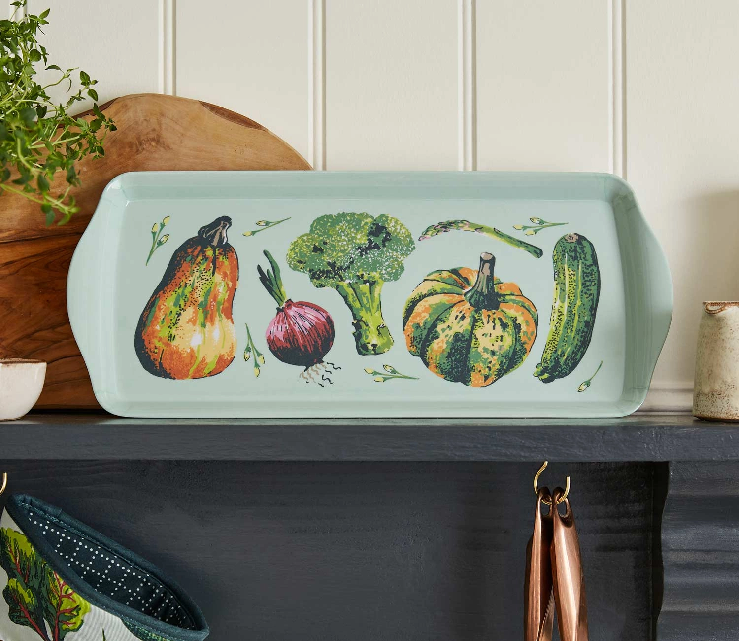 - Taca do serwowania Vegetable Medley marki Ulster Weavers. Wykonana z melaminy. Wzór inspirowany ilustracjami botanicznymi vintage, naturalne odcienie zieleni z jesienną paletą retro. Wymiary: 39 x 17 cm.