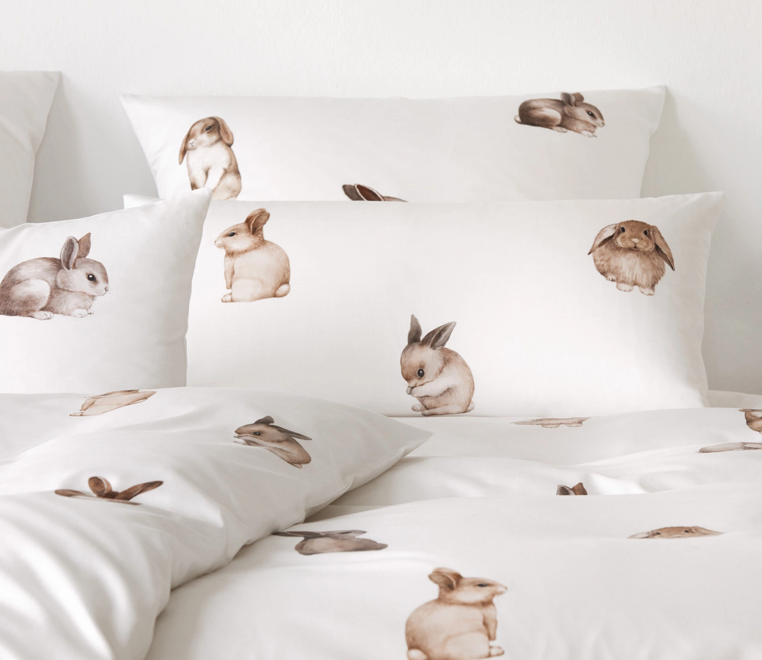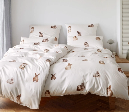 - Pościel z satyny jedwabnej Bunnies marki elegante. Zachwycający wzór przedstawiający urocze, beżowo-brązowe króliczki na jasnym tle. Jedwabna jakość szczególnie cienkich przędz jest przyjemna i delikatna w dotyku. Zapinana na zamek błyskawiczny.