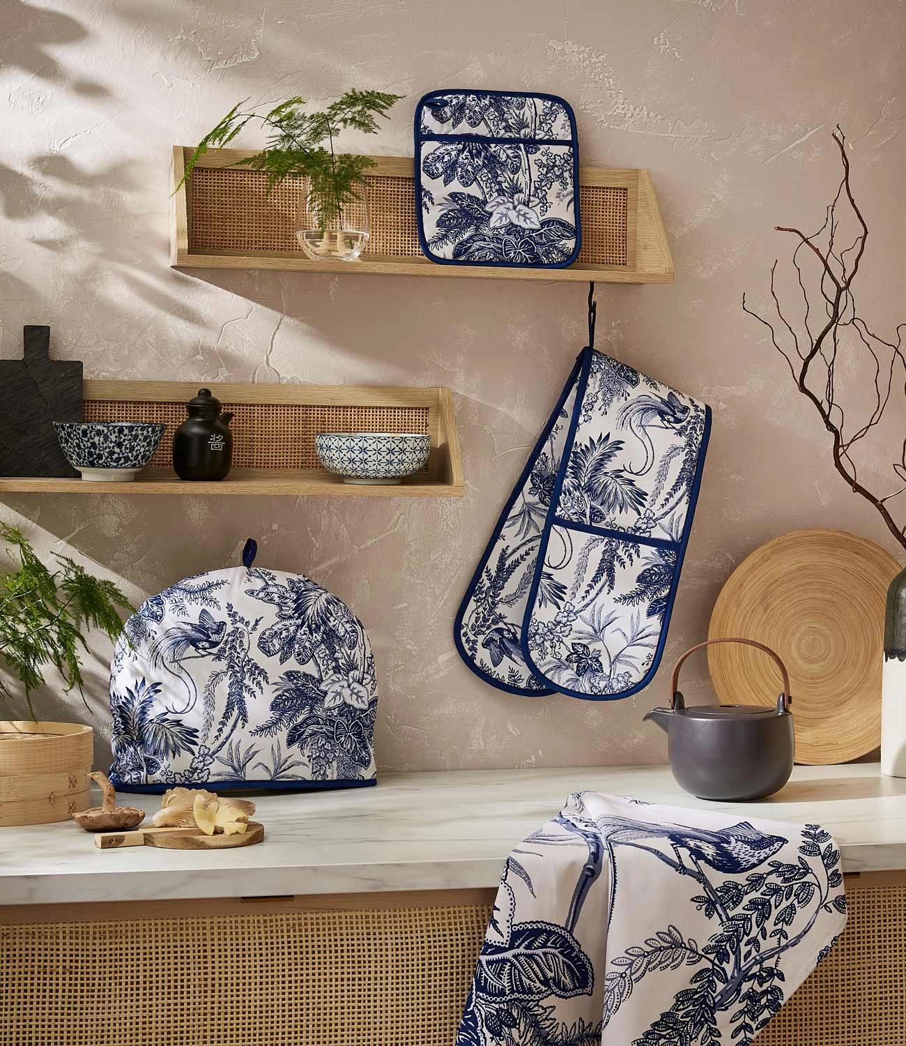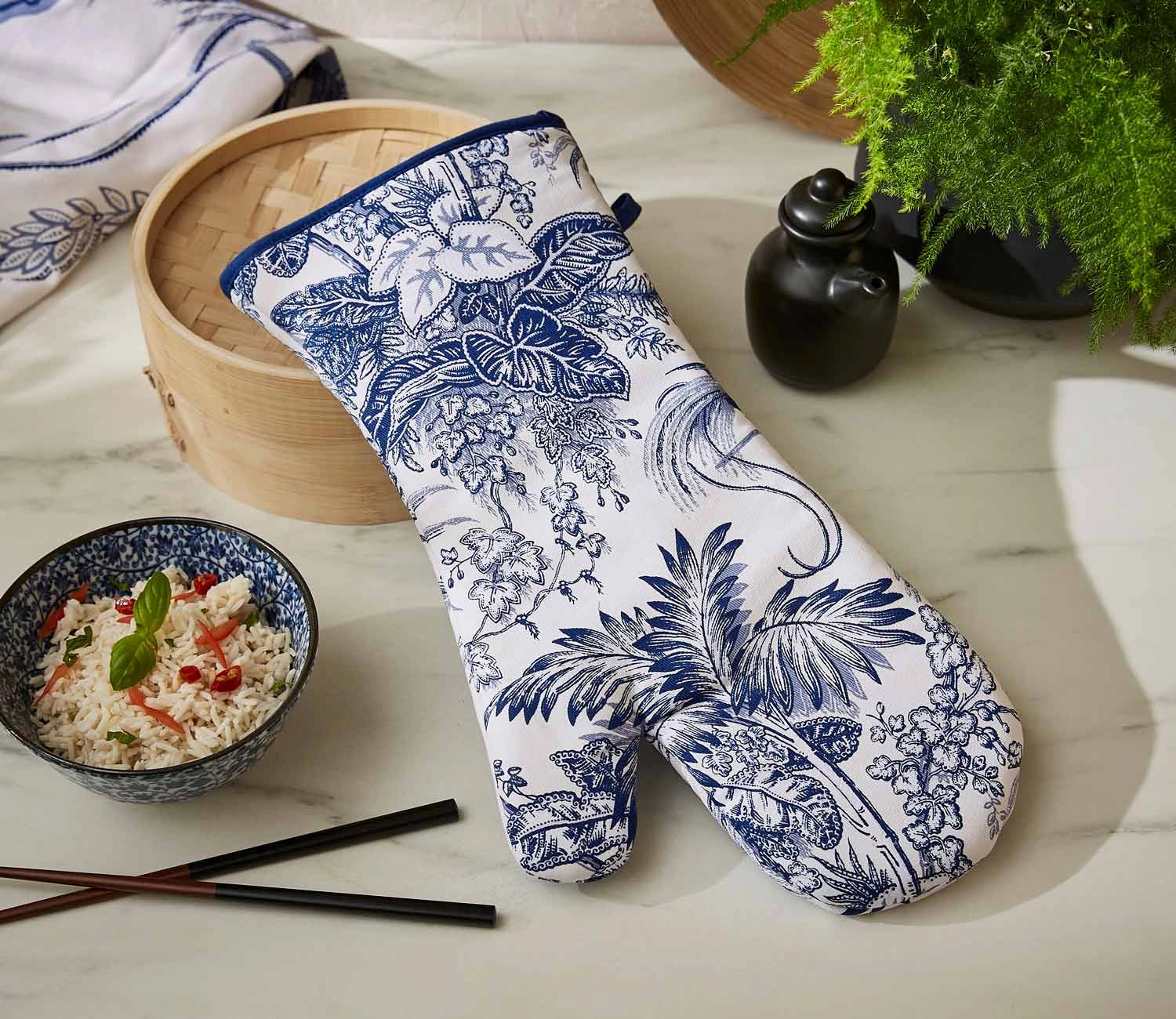 - Rękawica Willow Toile - wzór inspirowany holenderską ceramiką Delft i elementami chinoiserie. Stanowi ochronę dla dłoni przed gorącymi talerzami i tacami w kuchni. Wykonana w 100% z niebielonej bawełny z wypełnieniem poliestrowym.
