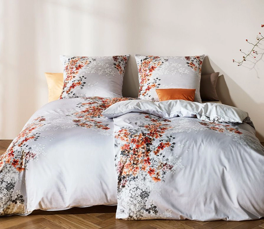 Komplet pościeli Fleuresse Black Premium 534509 wykonany z luksusowej szwajcarskiej satyny. Mocny kwiatowy wzór w ceglanym kolorze na szarym tle. Wyjątkowa jakość tkaniny wyprodukowanej w 100% z mako-bawełny zapewnia subtelny połysk oraz miękkość w dotyku.