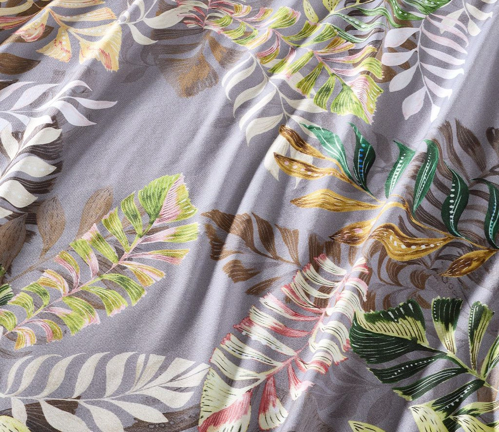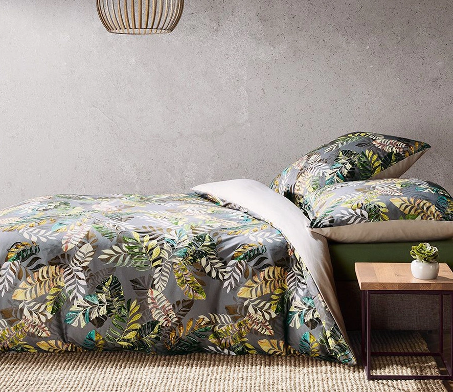 - Dwustronna pościel jerseyowa 74517 marki Fleuresse. Wzór w tropikalne, kolorowe liście na brązowym tle. Tył gładki. Wykonana w 100% z mako-bawełny. Tkanina jerseyowa jest miękka i przyjemna w dotyku, nie wymaga prasowania.