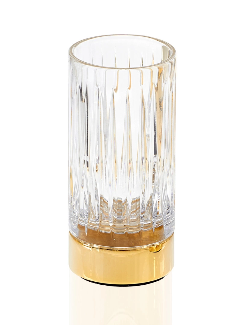 Kubek łazienkowy wolnostojący CENTURY SMG marki Decor Walther. Wykonany ze szlifowanego szkła kryształowego, podstawa zrobiona z mosiądzu pokrytego 24 karatowym złotem. Pasuje do kolekcji BAR.