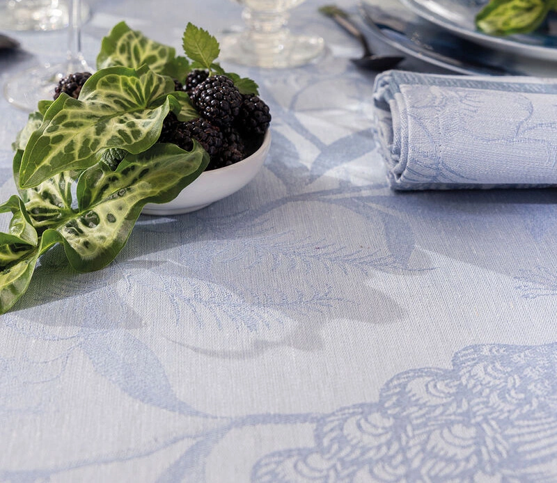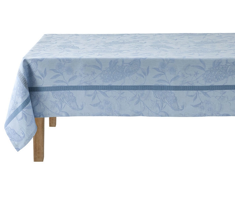 • Elegancki obrus wykonany w 100% z lnu - À L'orangerie Chardon, z motywem pawia, inspirowany francuskim ogrodem. Kolor szaro-niebieski. Subtelny, egzotyczny i łatwy do prasowania – idealny na wyjątkowe okazje i codzienny styl z klasą.