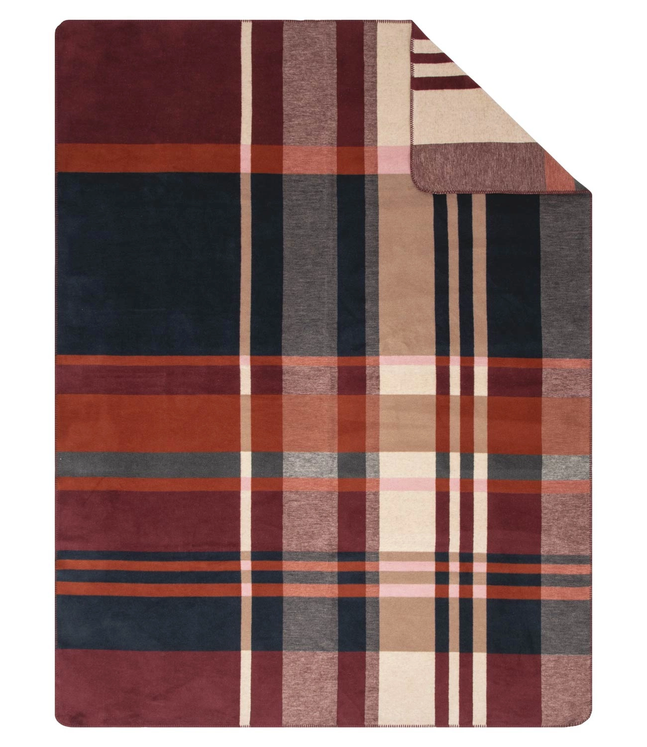 - Dwustronny koc Falkland marki Ibena w klasyczny wzór w kratę w odcieniach czerwieni, beżu i grafitu. Wykonany z przyjemnej w dotyku mieszanki bawełny z akrylem, dzięki czemu jest ciepły i miękki. Wykończony ściegiem dzierganym.