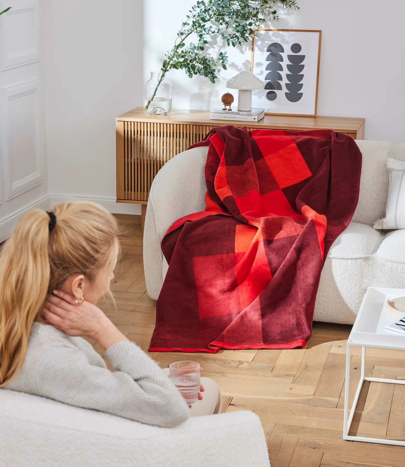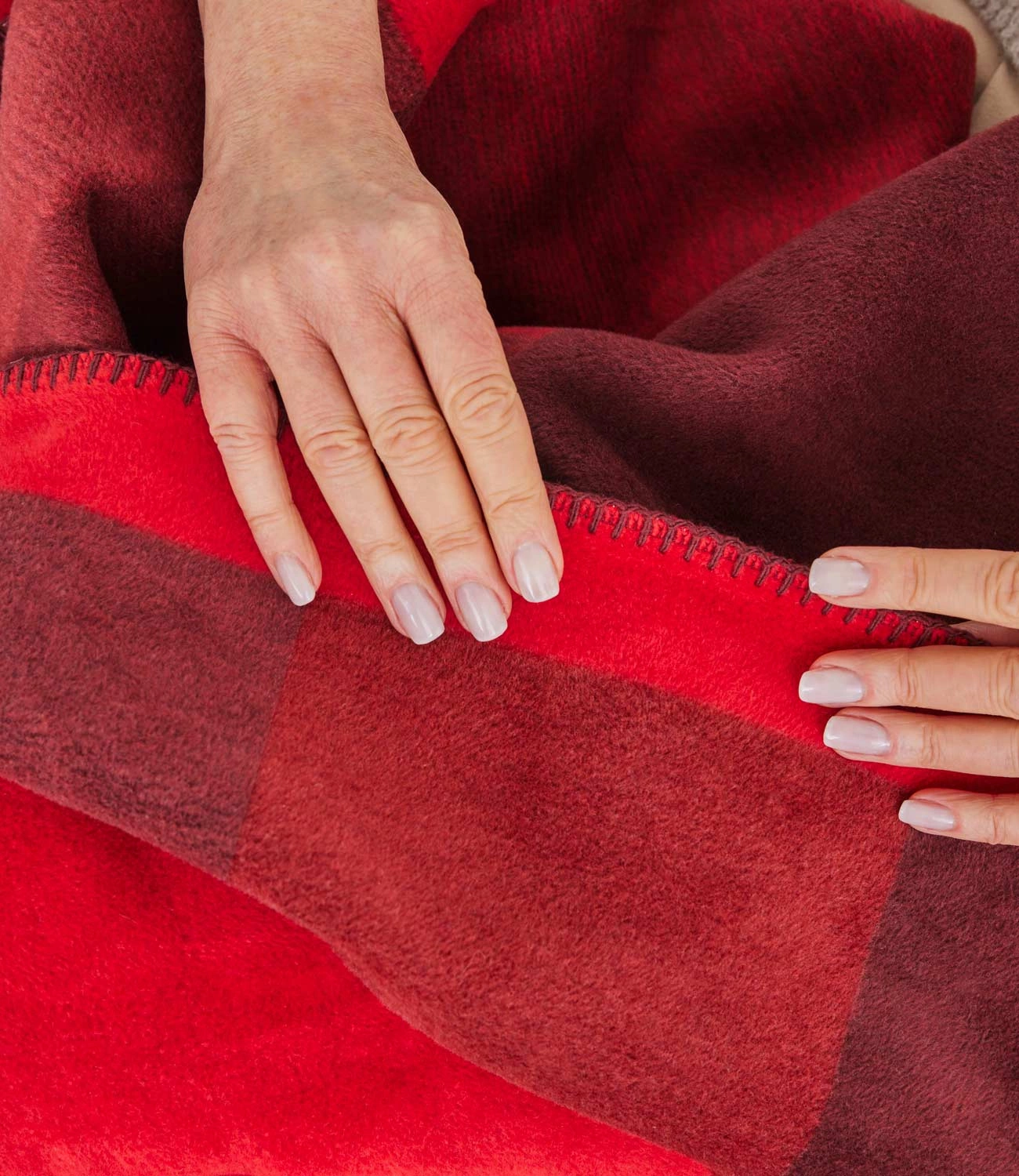 - Dwustronny koc Ravello marki Ibena w nowoczesny wzór w intensywnych odcieniach czerwieni, z eleganckim wykończeniem na brzegach. Wykonany z przyjemnej w dotyku mieszanki bawełny z akrylem, dzięki czemu jest ciepły i miękki. Wykończony ściegiem dzierganym.