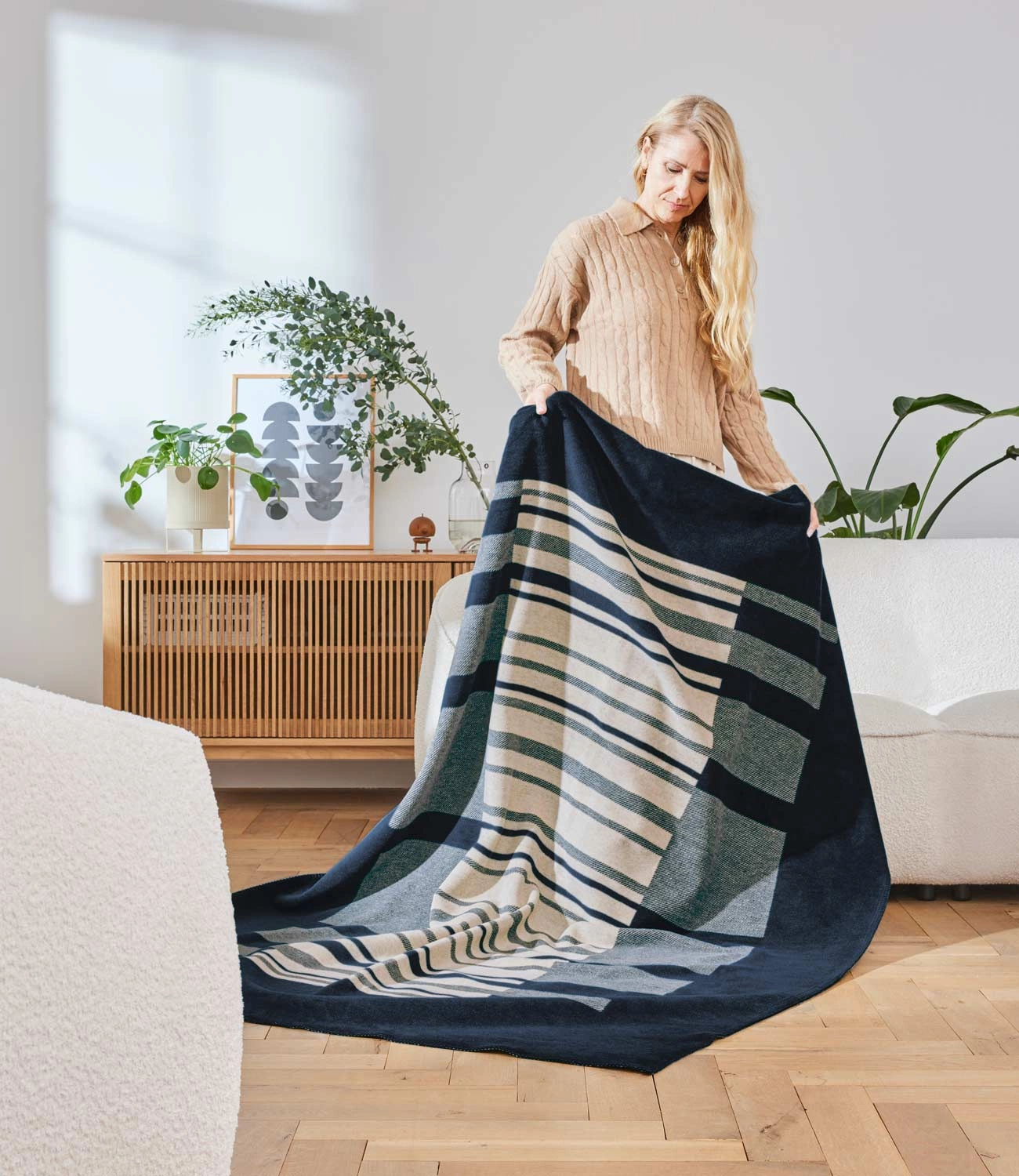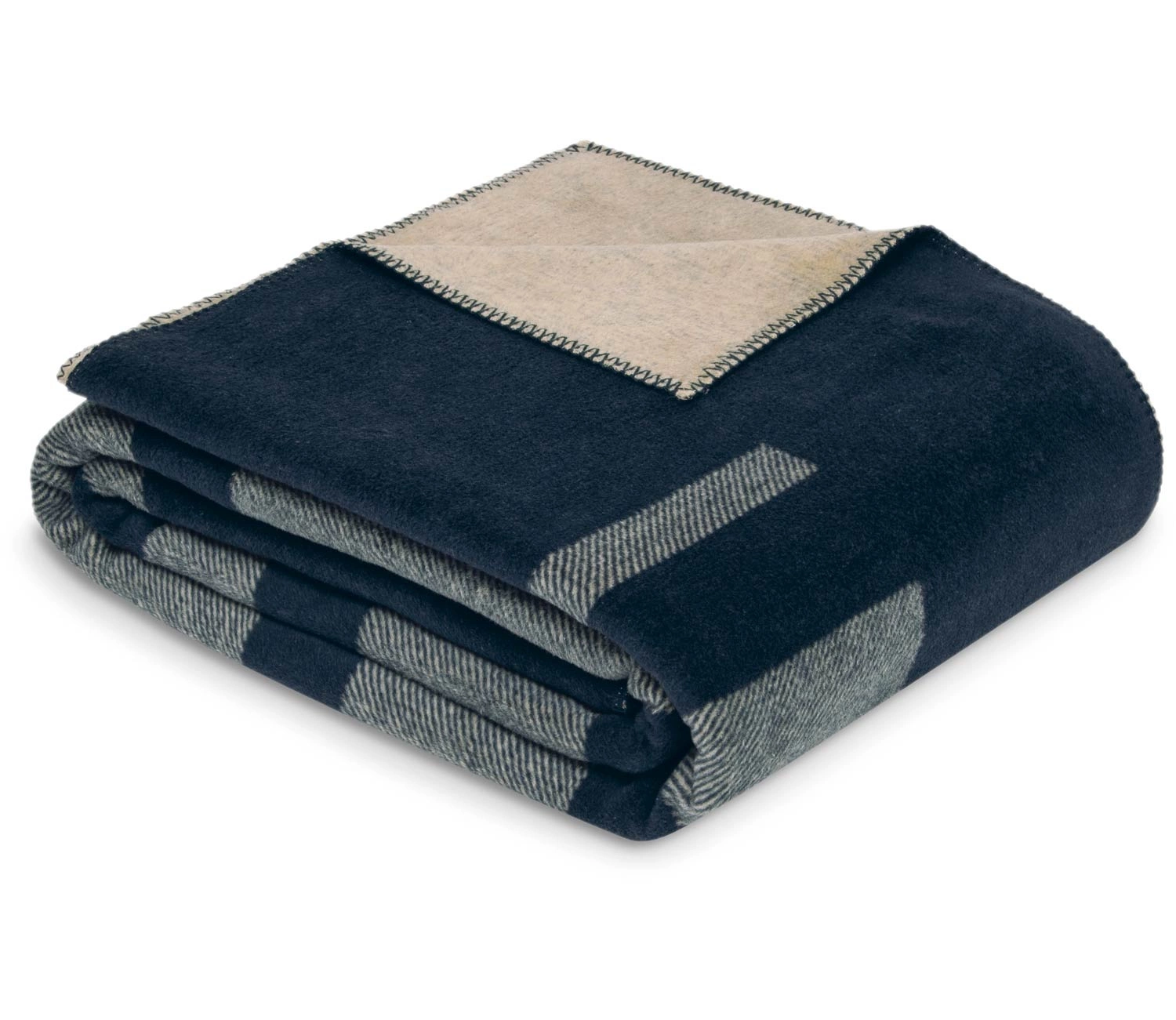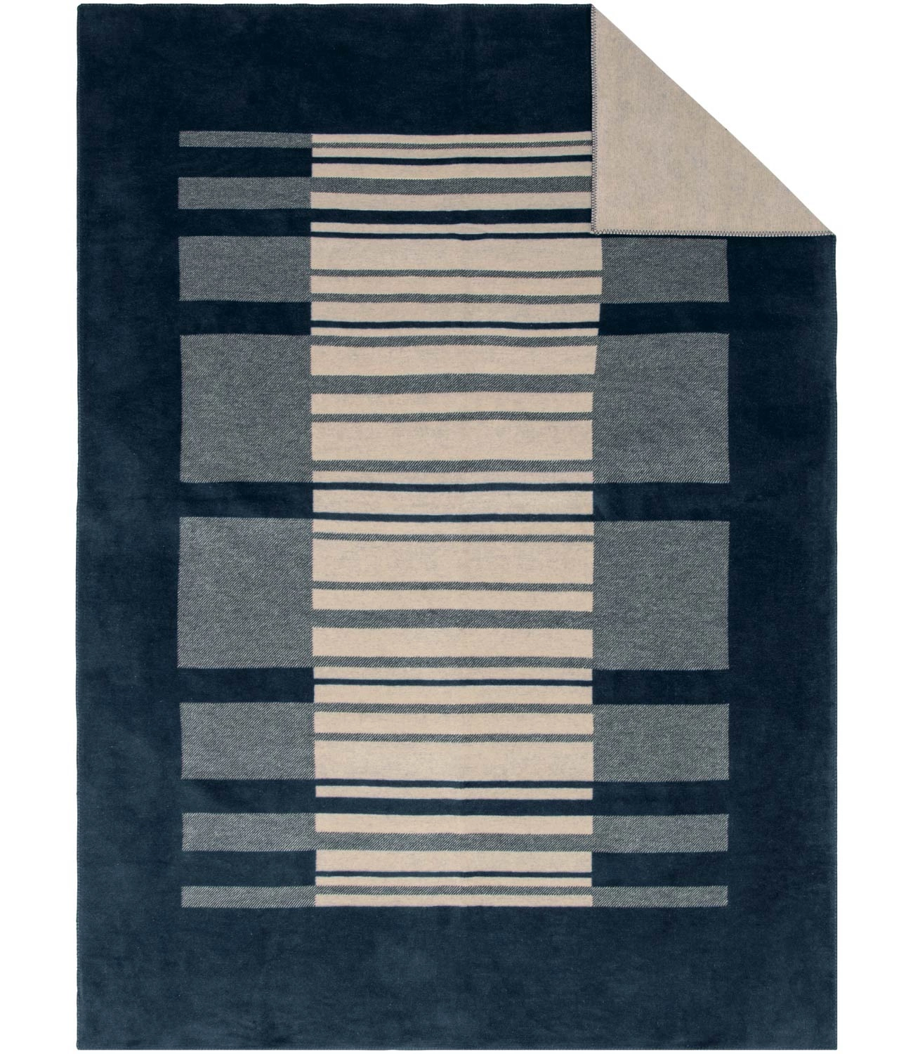 • Dwustronny koc Corato marki Ibena w nowoczesny wzór w różnorodne pasy w eleganckich odcieniach beżu i granatu. Wykonany z przyjemnej w dotyku mieszanki bawełny z akrylem, dzięki czemu jest ciepły i miękki. Wykończony ściegiem dzierganym.