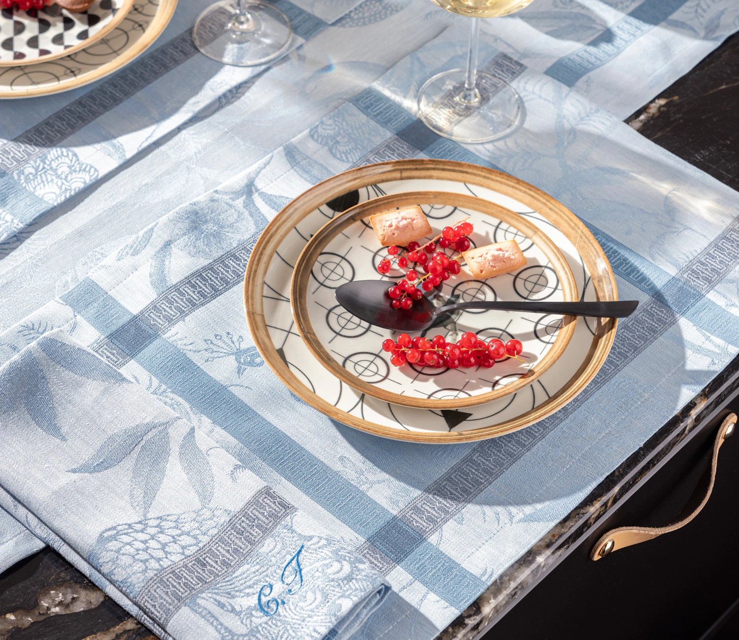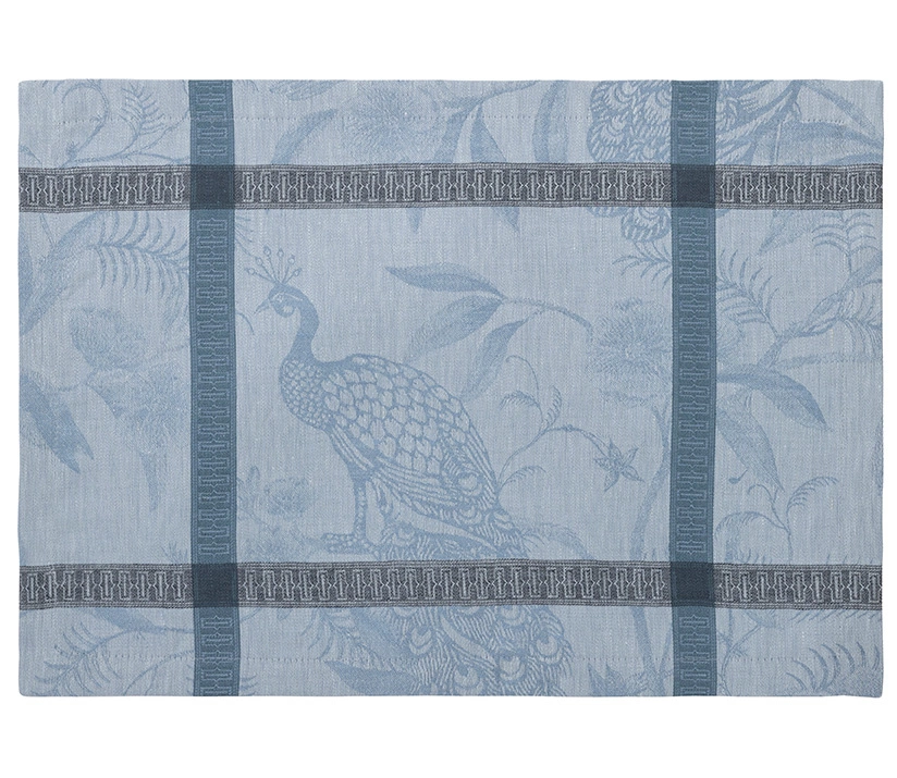 Eleganckie podkładki na stół, wykonane w 100% z lnu z plamoodpornym wykończeniem - À L'orangerie Chardon, z motywem pawia, inspirowane francuskim ogrodem. Kolor szaro-niebieski. Łatwe do prasowania – idealne na wyjątkowe okazje i codzienny styl z klasą.