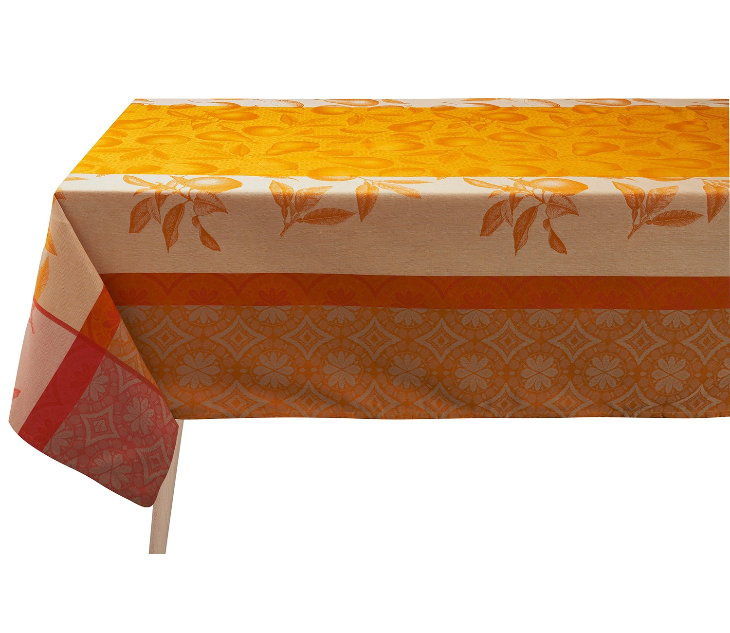 - Bawełniany obrus Arrière-Pays Melon inspirowany klimatem Prowansji. Kolor pomarańczowo-beżowy. Wyjątkowa miękkość i przyjemny dotyk dzięki wyjątkowo długim włóknom bawełny. Precyzyjnie tkany wzór z motywem owoców.