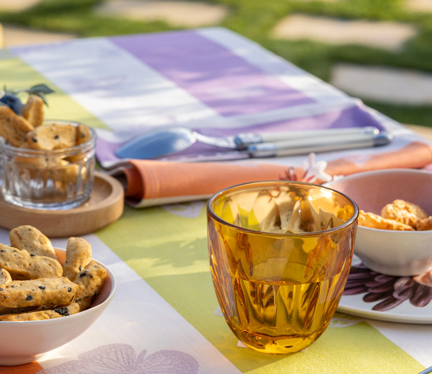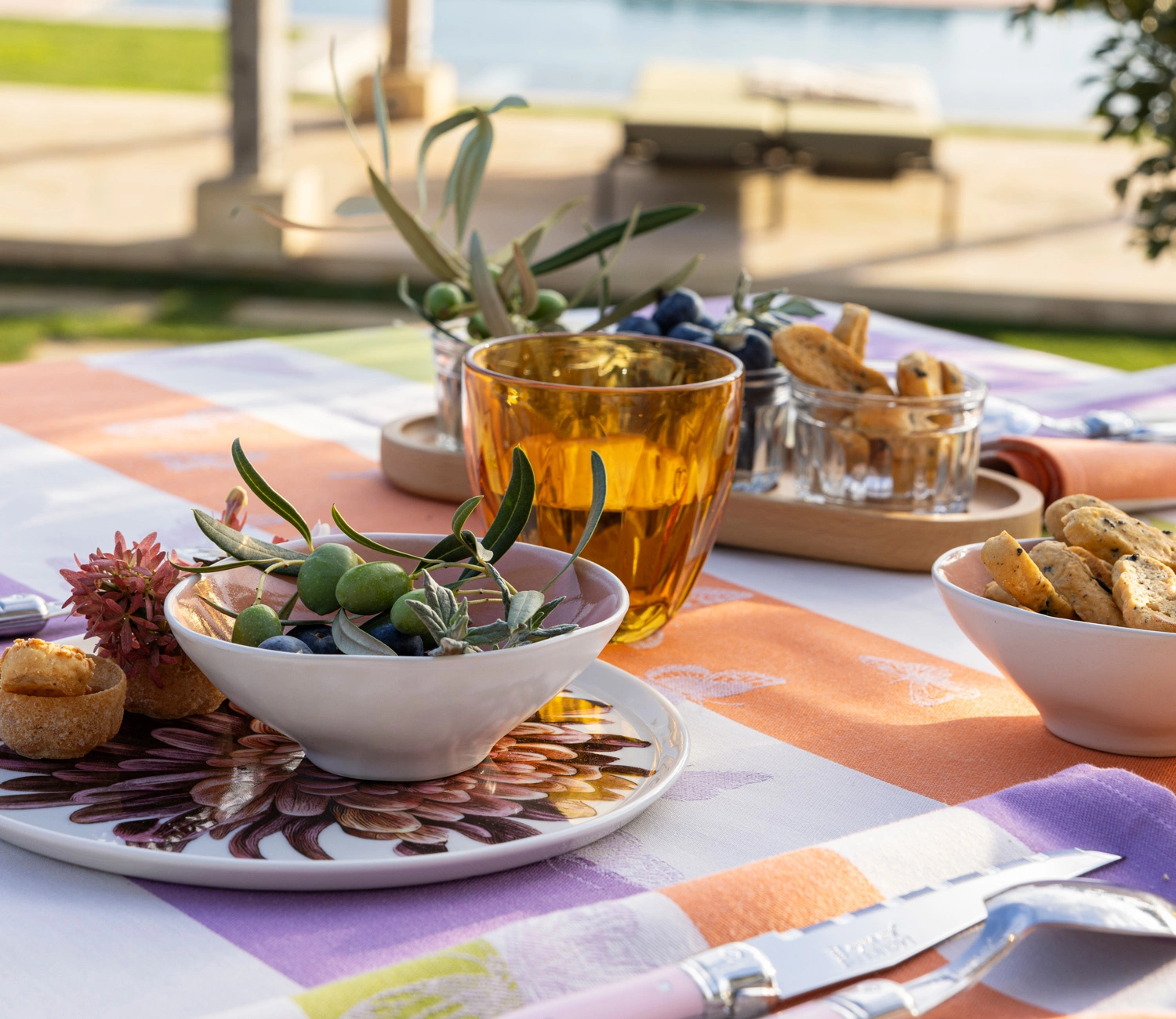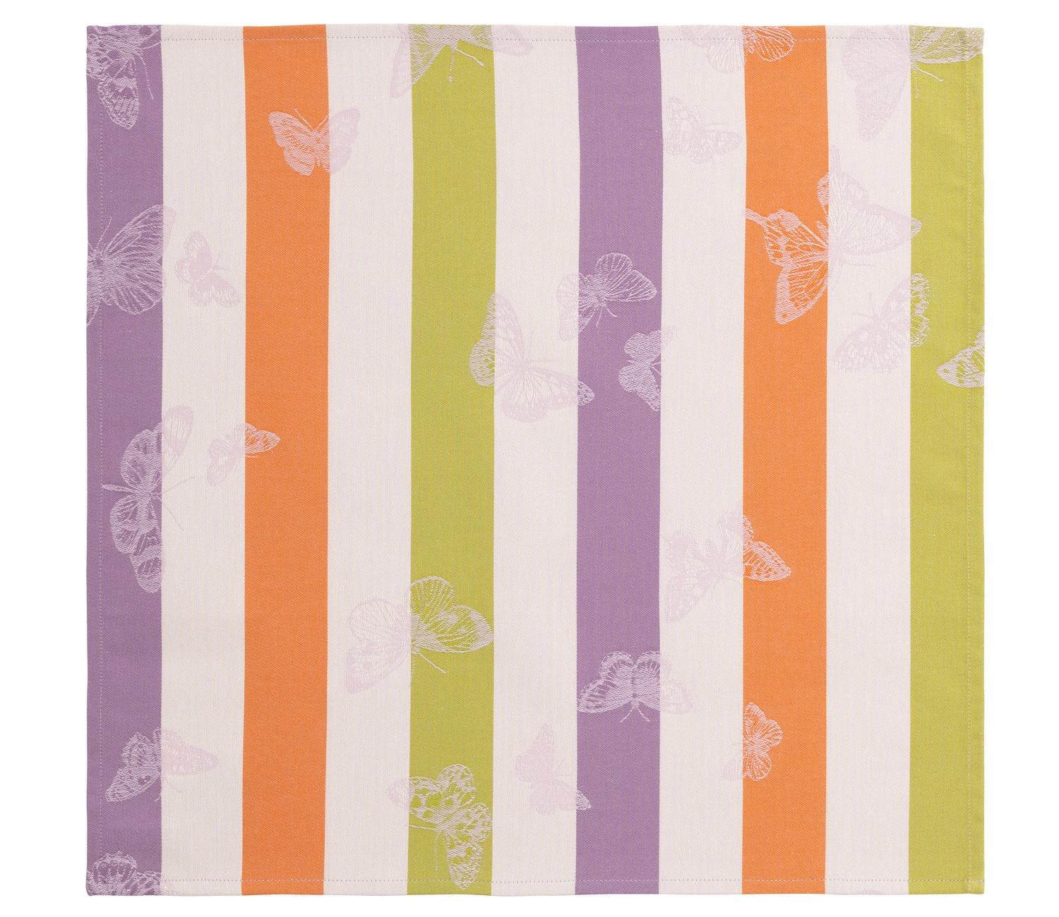 - Bawełniane serwetki Bal Des Papillons Lilas w motyle i kolorowe zielono-fioletowe pasy. Wykonane z czesanej bawełny o długich włóknach, odporny na deformacje, o wyjątkowej trwałości i niezwykłej precyzji wzoru, poddane technologii Irretrex.