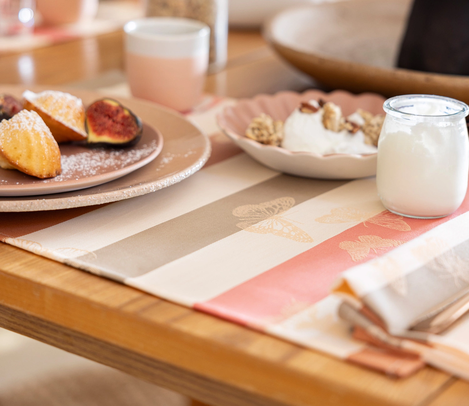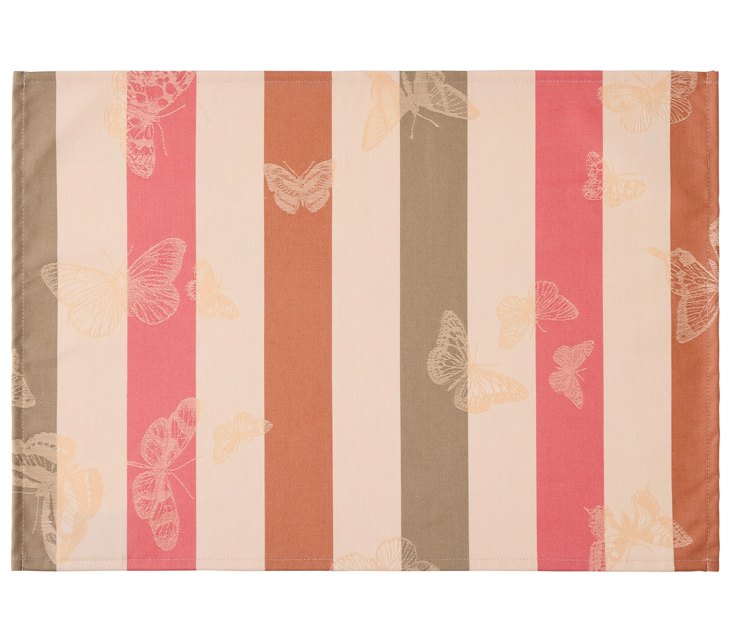 - Podkładki na stół Bal Des Papillons Peche w motyle i kolorowe brzoskwiniowo-różowe pasy. Wykonane są z wysokiej jakości bawełny i pokryte cienką warstwą akrylu, która sprawia, że są wodoodporne i odporne na plamy.
