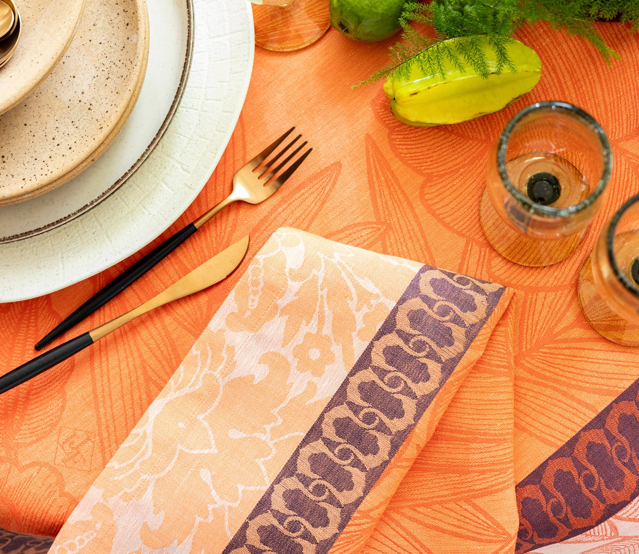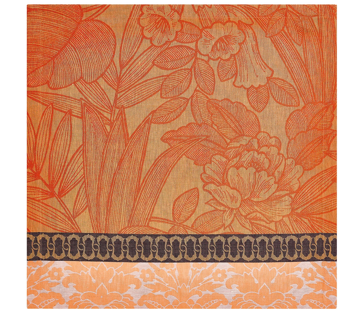 Eleganckie, żakardowe serwetki stołowe wykonane w 100% z lnu. Tropikalny wzór inspirowany egzotyczną roślinnością w kolorze pomarańczowym. Subtelne i łatwe do prasowania – idealny na wyjątkowe okazje i codzienny styl z klasą.