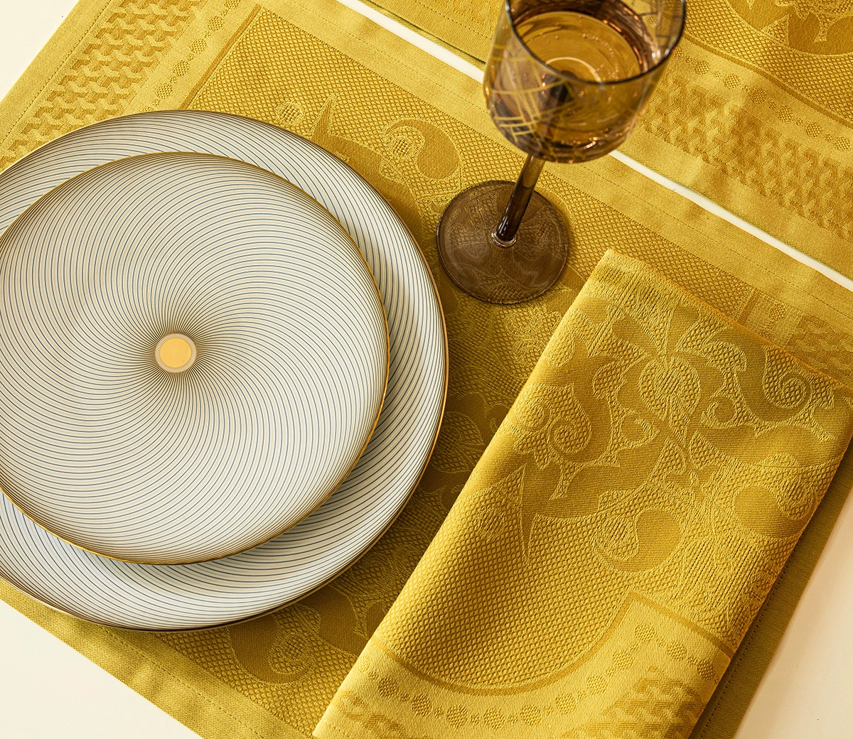 Serwetki Palais Vénitien Ocre inspirowane są marmurowymi podłogami kultowych pałaców Wenecji a barokowe arabeski i geometryczne wzory przywołują włoską elegancję.