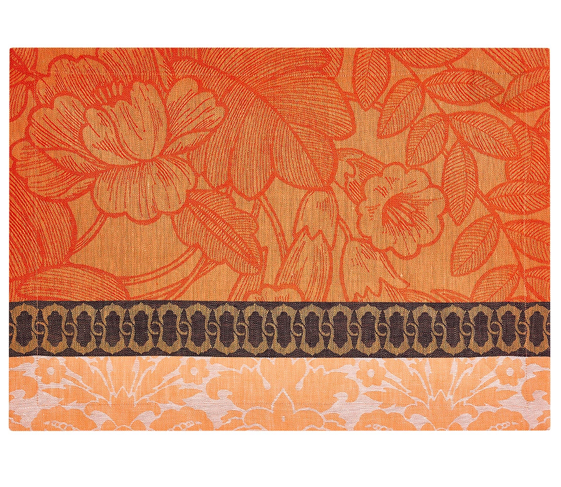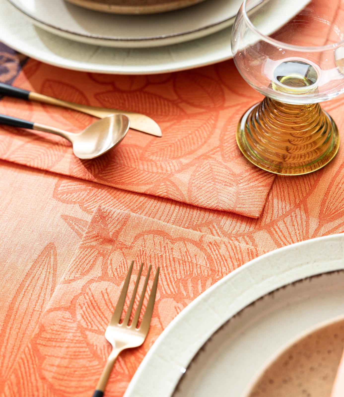 Lniane podkładki Tropicale Goyave - radosne, egzotyczne i świeże. Kolor pomarańczowy. Tkane z europejskiego lnu (Masters of Linen®), zachwycają wzorami i kolorami. Plamoodporne wykończenie. Łatwe do prasowania – idealne na wyjątkowe okazje.
