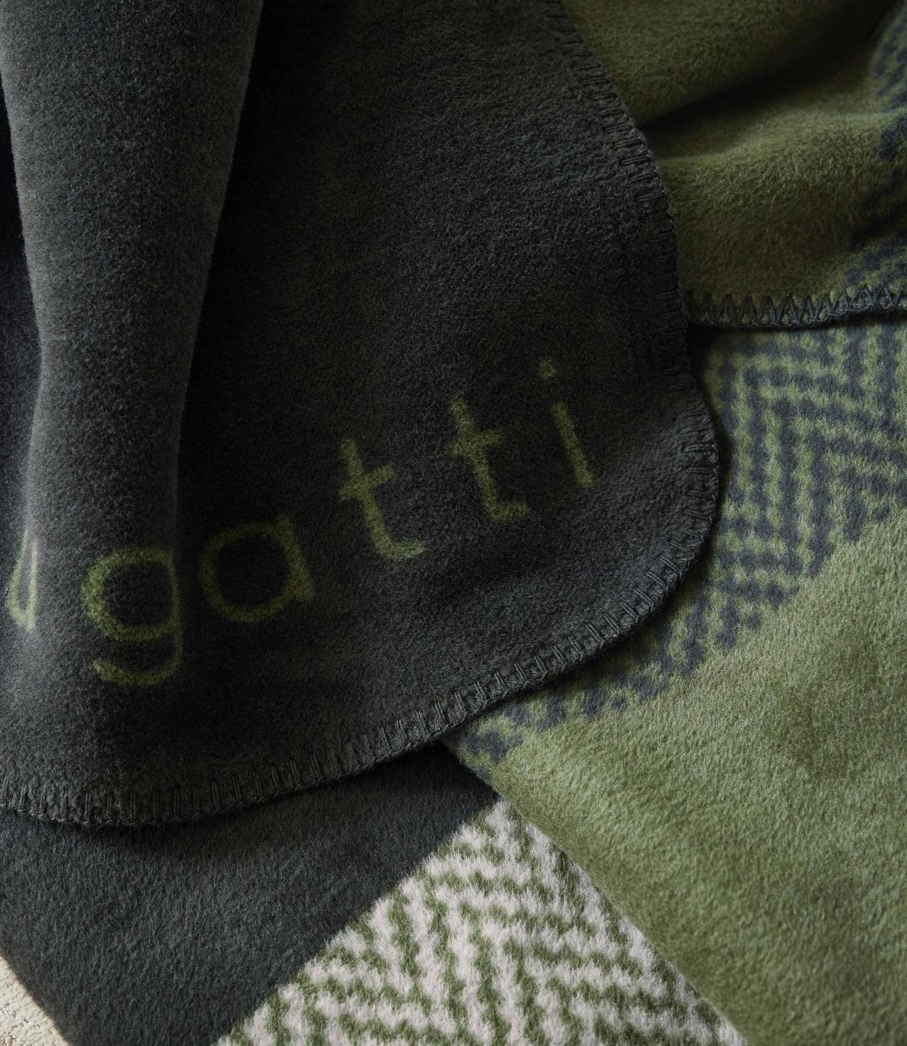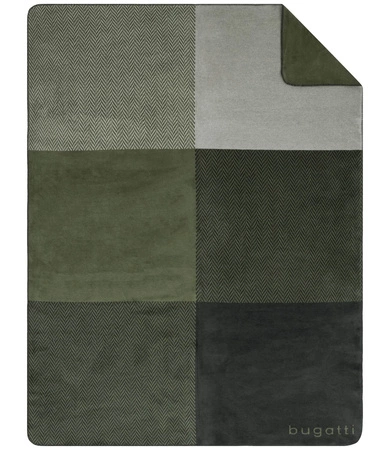 - Dwustronny, żakardowy koc bugatti w dużą, nowoczesną kratę o teksturze jodełki w odcieniach zieleni, z delikatnym logo marki. Wykonany z przyjemnego w dotyku połączenia bawełny i akrylu, dzięki czemu jest ciepły i miękki. Wykończony ściegiem dzierganym.