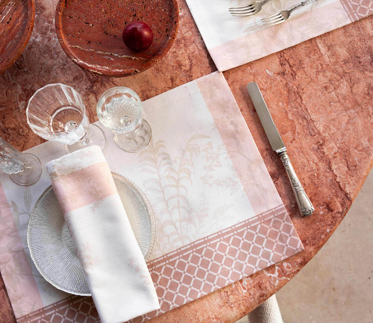 • Podkadki na stół Jardin d'Éden Chair od Le Jacquard Français to romantyczna tekstylna podróż do letniego ogrodu. Tkaniny z długowłóknistej bawełny czesanej, z precyzyjnym wzorem i plamoodpornym wykończeniem.