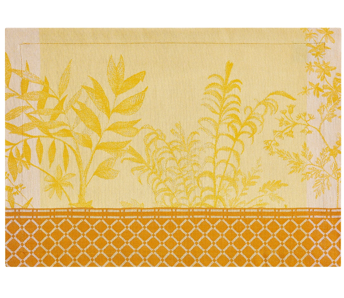 - Podkadki na stół Jardin d'Éden Pollen od Le Jacquard Français to romantyczna tekstylna podróż do letniego ogrodu. Tkanina z długowłóknistej bawełny czesanej, z precyzyjnym wzorem i plamoodpornym wykończeniem. Kolor żółty.