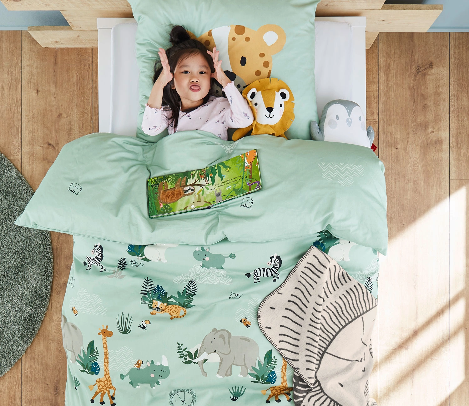 • Pościel dziecięca z satyny bawełnianej marki s.Oliver. Wzór ze zwierzątkami sawanny na jasnozielonym tle wprowadzi do pokoju dziecka odrobinę egzotyki i przygody. Wykonana ze 100% bawełny - miękka, gładka i przewiewna. Zapinana na zamek błyskawiczny.