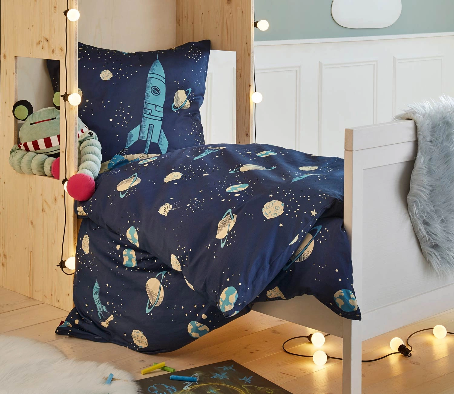 - Pościel dziecięca z satyny bawełnianej marki s.Oliver. Wzór z planetami i statkami kosmicznymi na ciemnogranatowym tle pobudza wyobraźnię i zabiera w gwiezdną podróż. Wykonana ze 100% bawełny - miękka, gładka i przewiewna. Zapinana na zamek błyskawiczny.