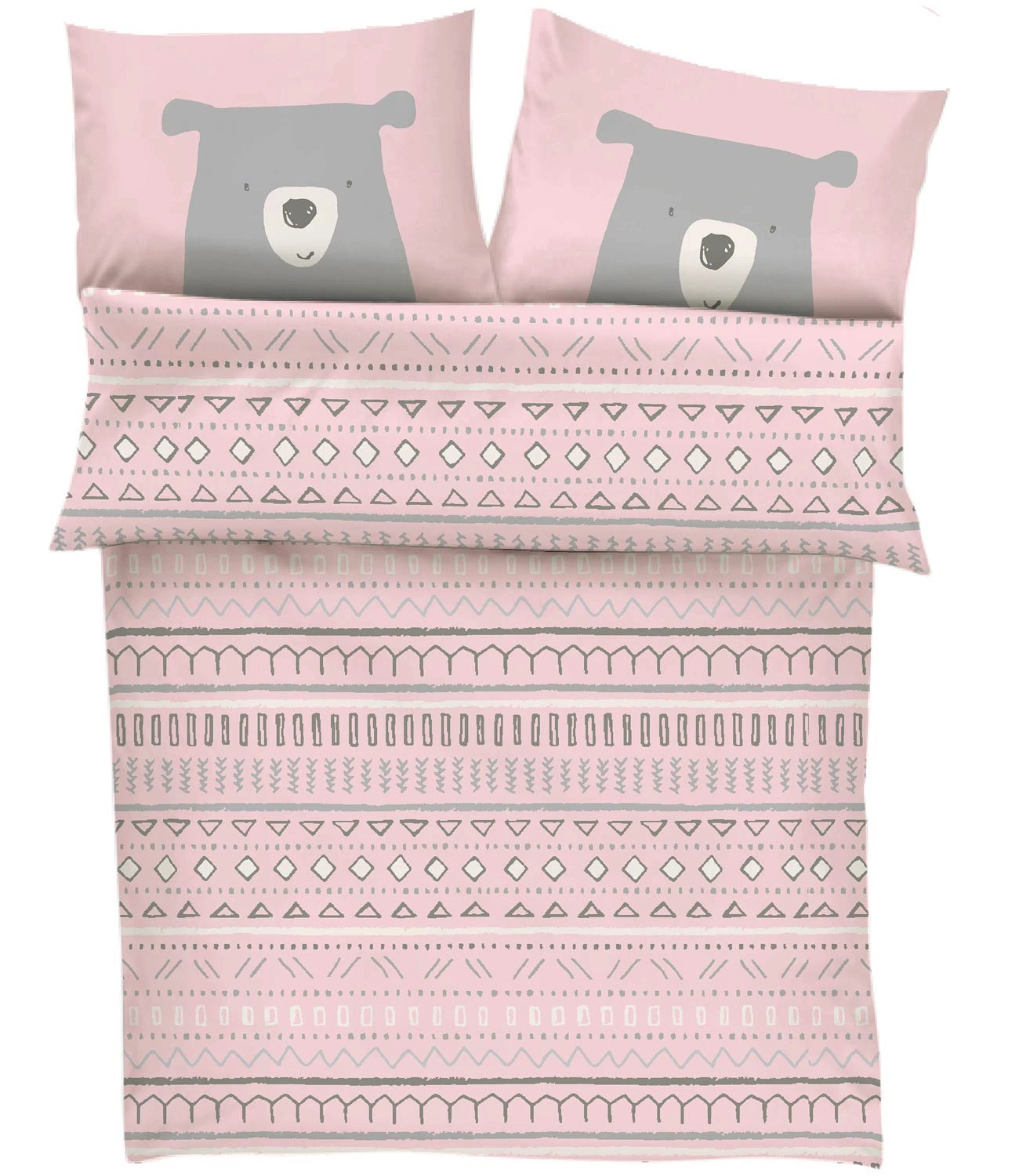 Dziecięca pościel z satyny bawełnianej marki s.Oliver to doskonała propozycja dla najmłodszych, która łączy uroczy design z komfortem najwyższej jakości. Na różowym tle widnieje przyjazny miś w otoczeniu subtelnych, szarych wzorków, co nadaje całości harmonijny, łagodny charakter – idealny do stworzenia spokojnej atmosfery w dziecięcej sypialni.