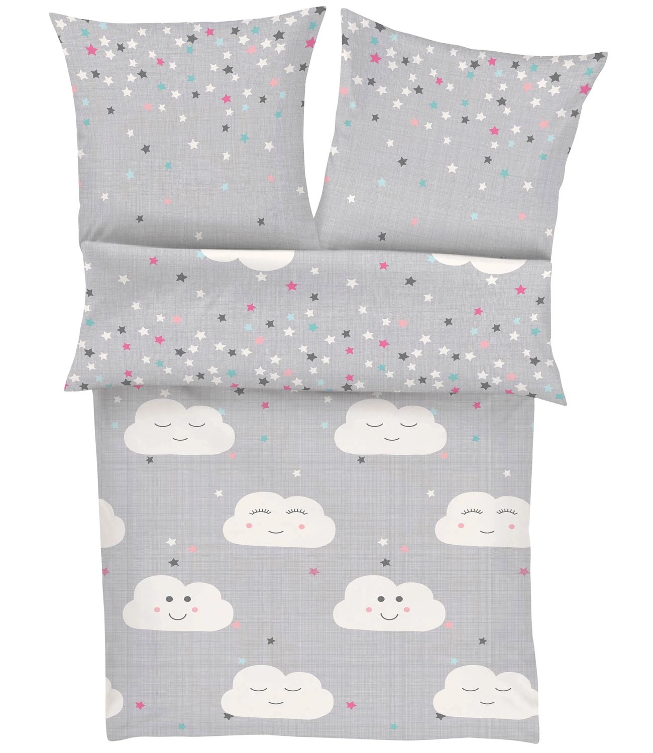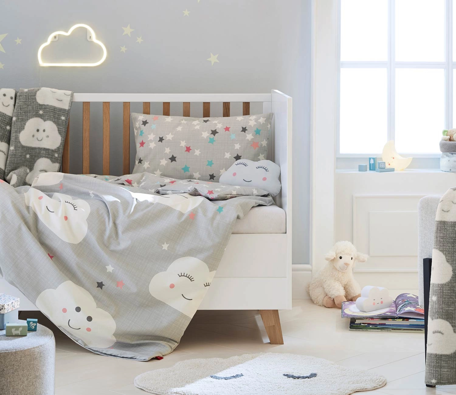 • Pościel dziecięca z satyny bawełnianej marki s.Oliver. Uroczy wzór z chmurkami i gwiazdkami na szarym tle wprowadzi do pokoju dziecka spokojną, przytulną atmosferę. Wykonana ze 100% bawełny - miękka, gładka i przewiewna. Zapinana na zamek błyskawiczny.